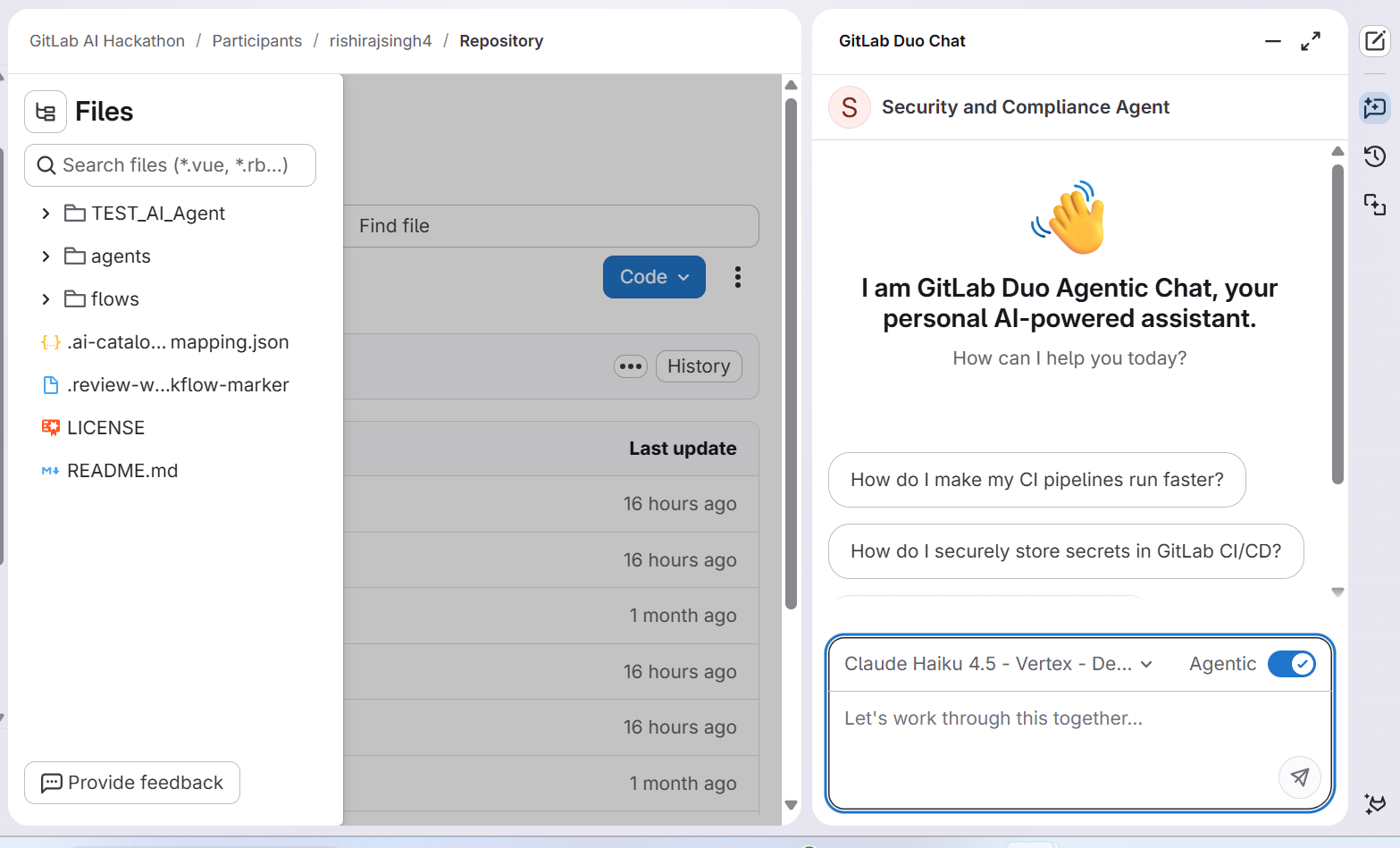 We developed AI agent as a custom AI agent within GitLab Duo, leveraging the Web IDE to seamlessly integrate it into the developer workflow. The agent is powered by a structured set of instructions and rule definitions that guide its behavior in analyzing code for security vulnerabilities, code complexity, and best practice compliance.