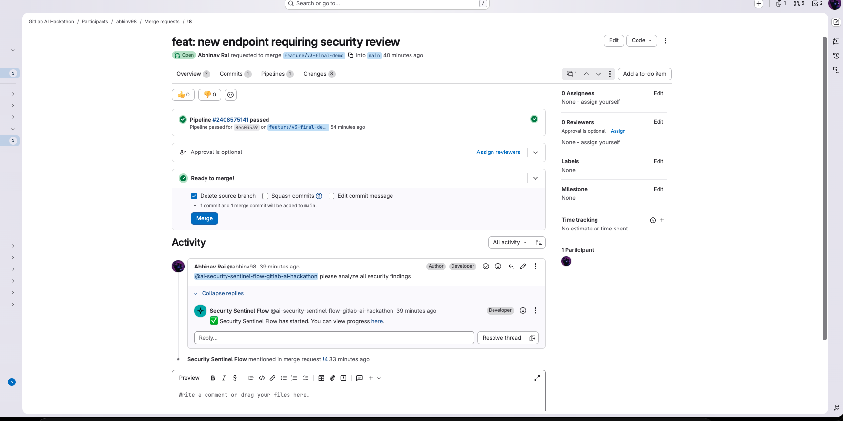 Security Sentinel is a 3-component flow on the GitLab Duo Agent Platform. You comment on a merge request, and it does the rest: