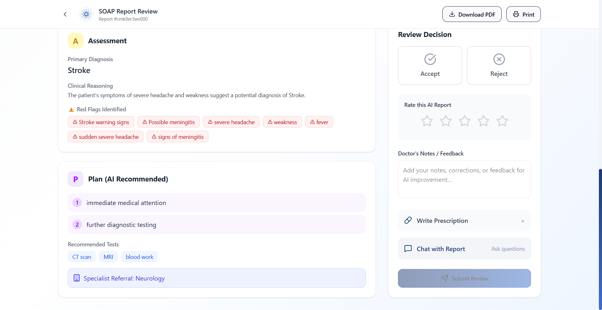 - Generation of structured SOAP reports (Subjective, Objective, Assessment, Plan)