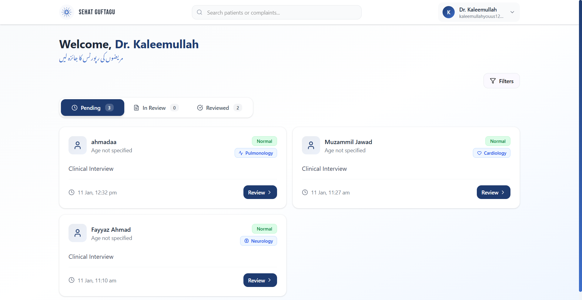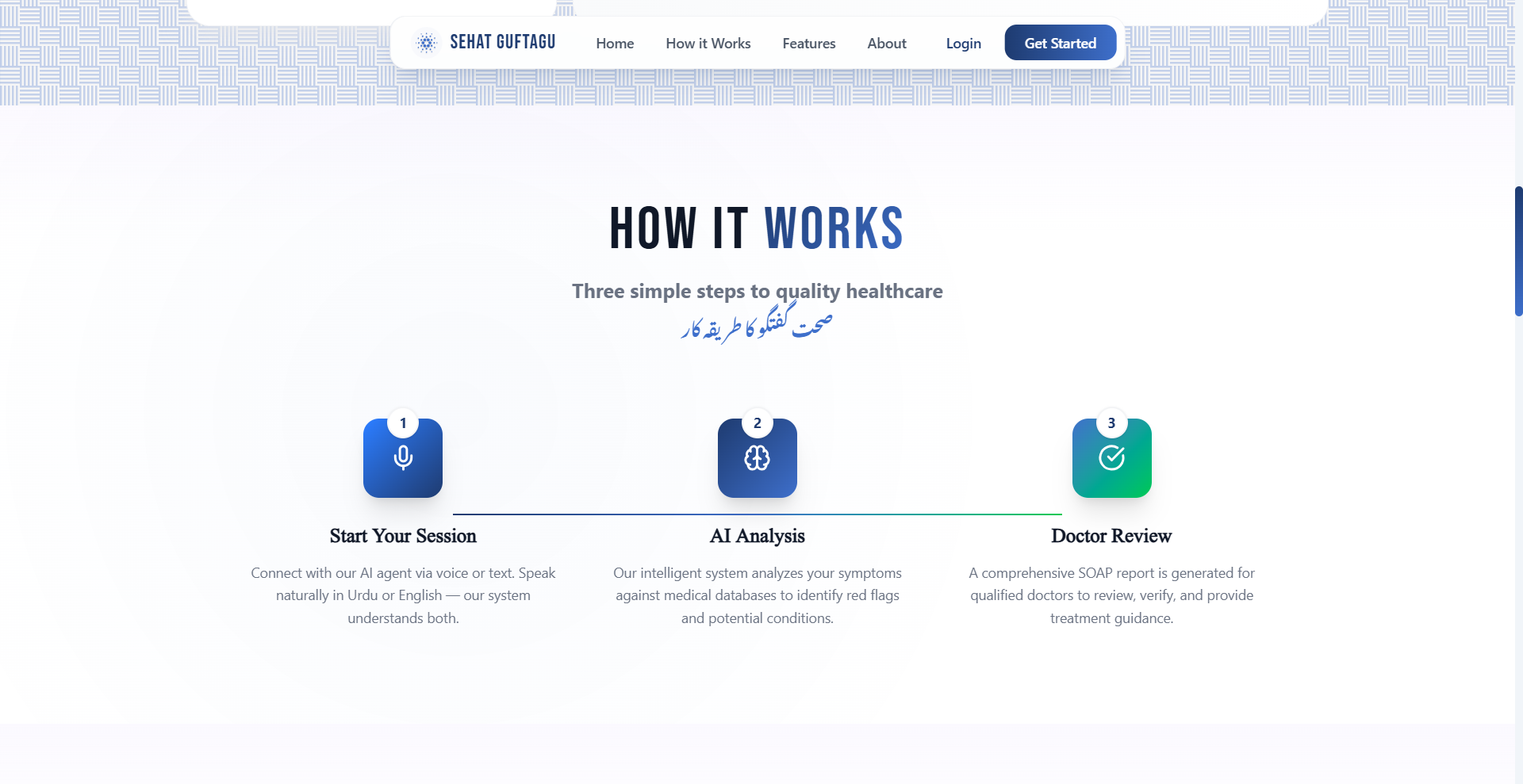 Sehat Guftagu is an AI-powered health assistant that conducts structured medical interviews with patients in their preferred language and converts those conversations into clear, doctor-ready clinical reports.