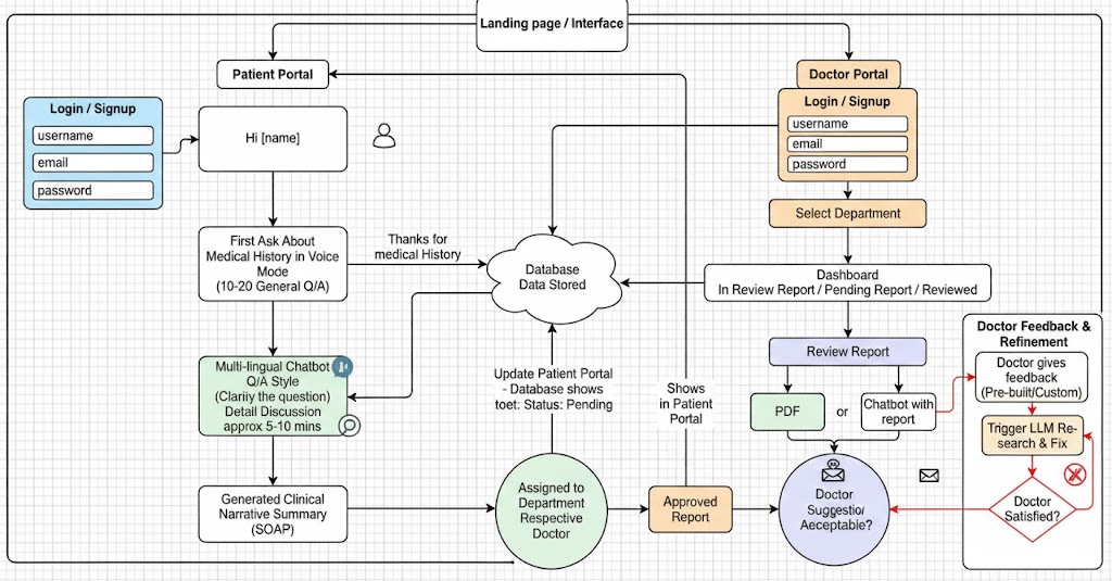 We imagined a system where patients could calmly explain their problems in their own language, while doctors receive a clear, structured summary before meeting them.