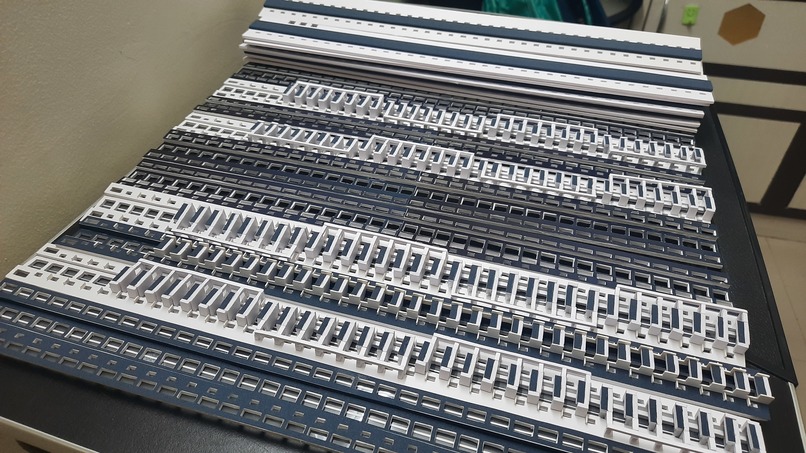 Individually fabricated wall and floor components arranged by floor level before manual assembly of the building model.