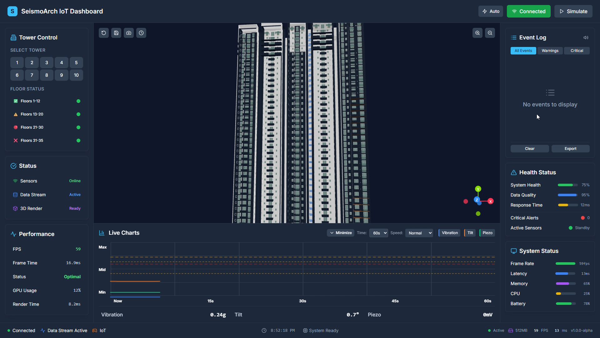 - Select individual towers to view live sensor charts