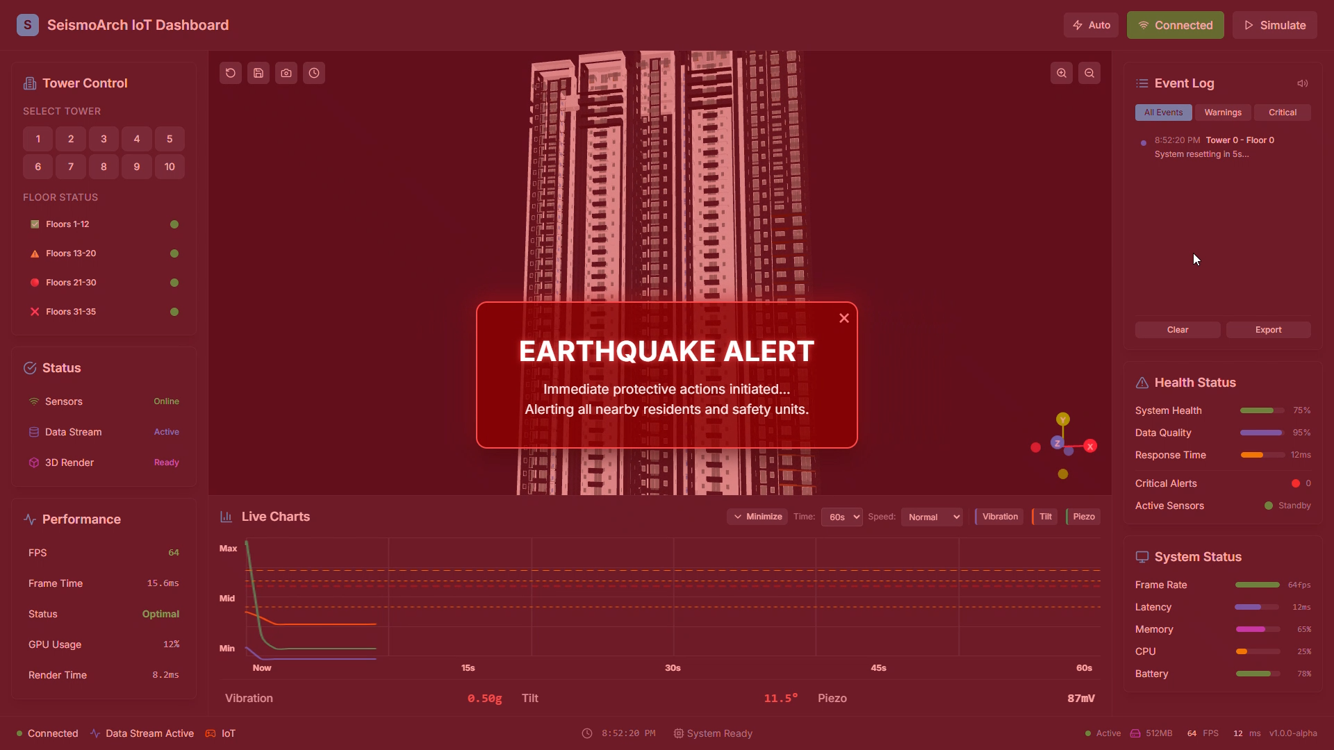 SeismoArch IoT dashboard displaying a simulated earthquake event and system-wide alert state during testing.