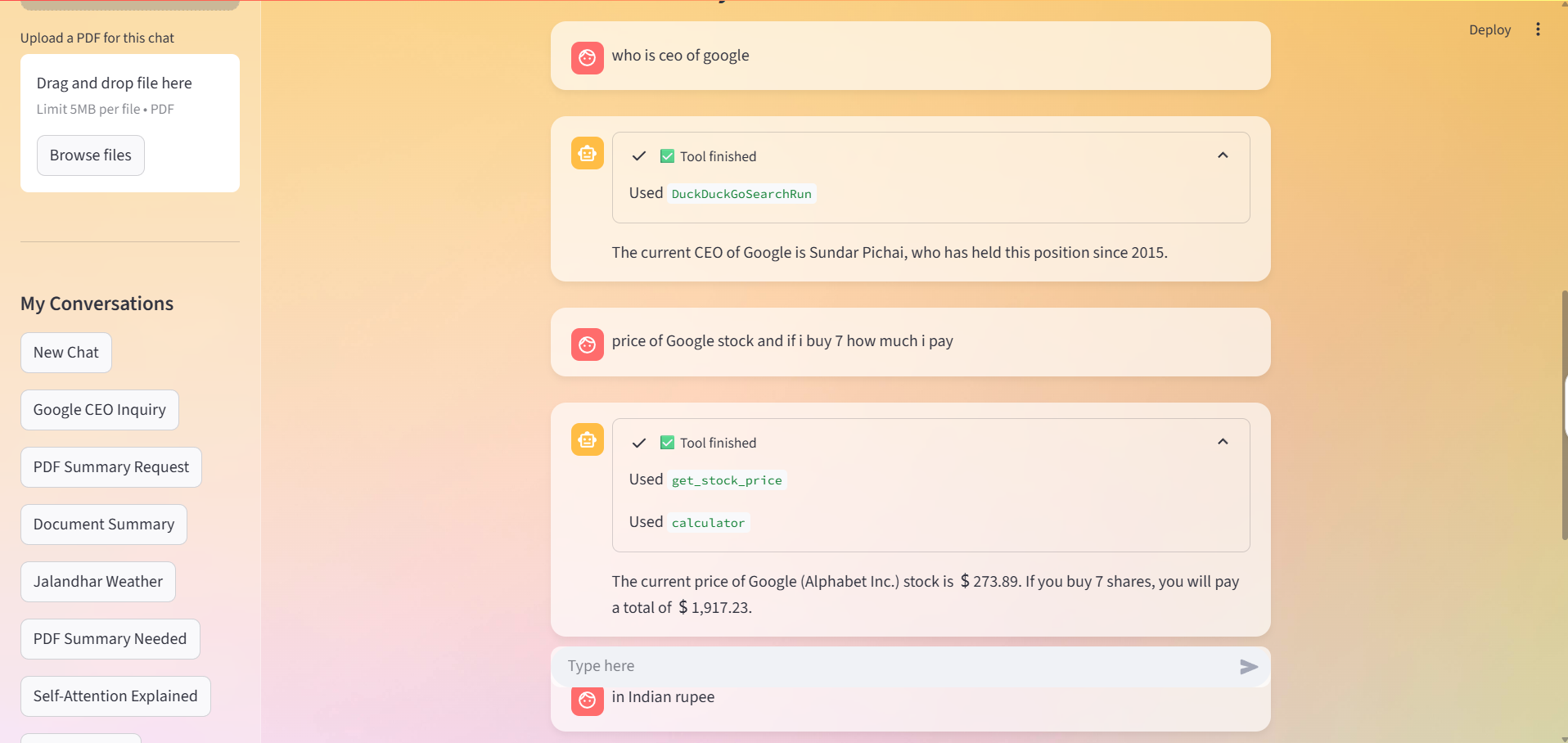 - Integrates multiple tools: • Web search • Calculator • Stock data • Currency conversion • Weather data