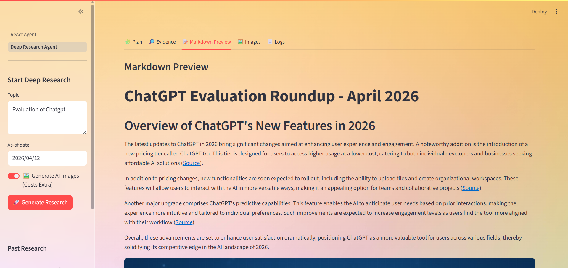 - Supports image generation during deep research workflows