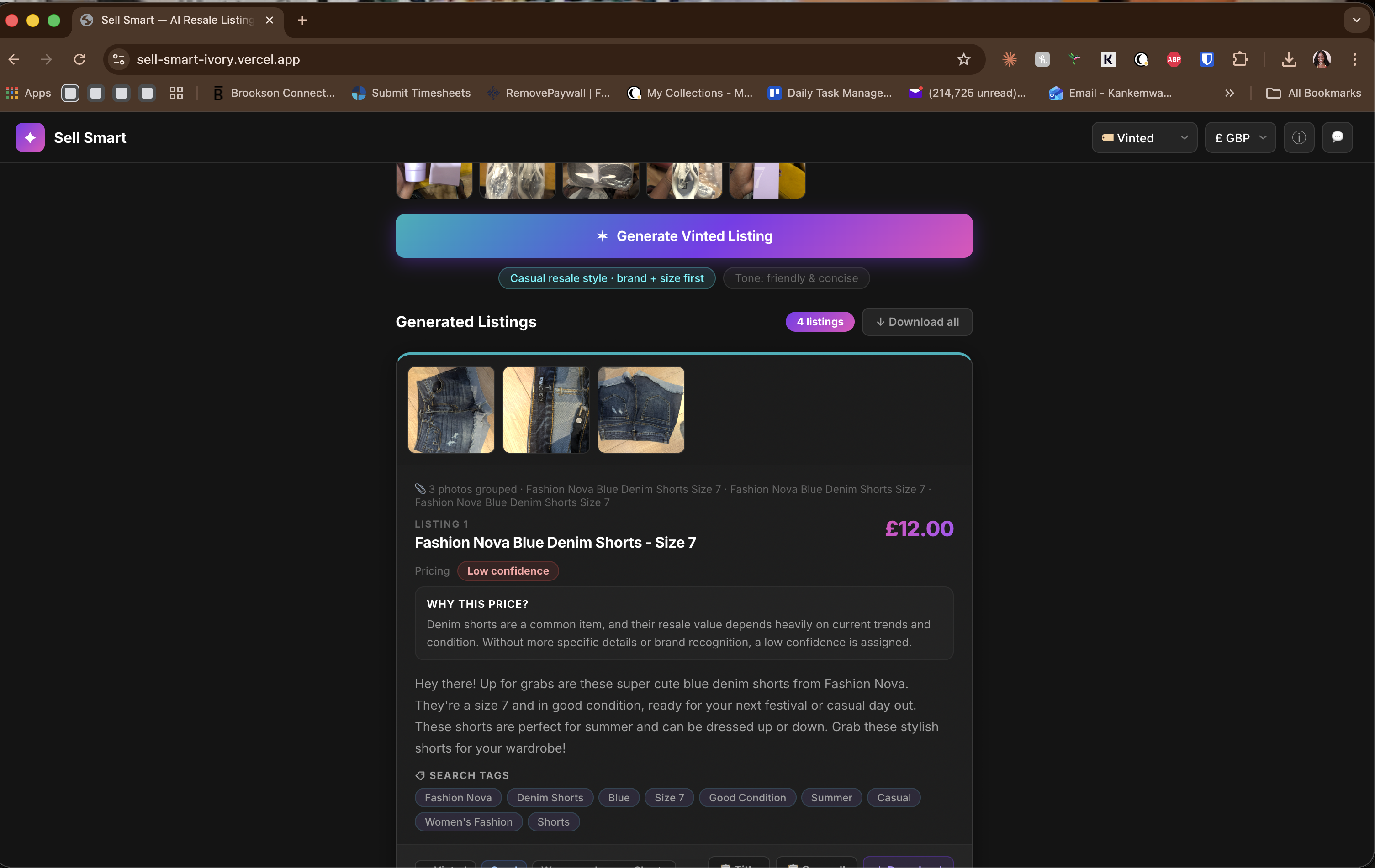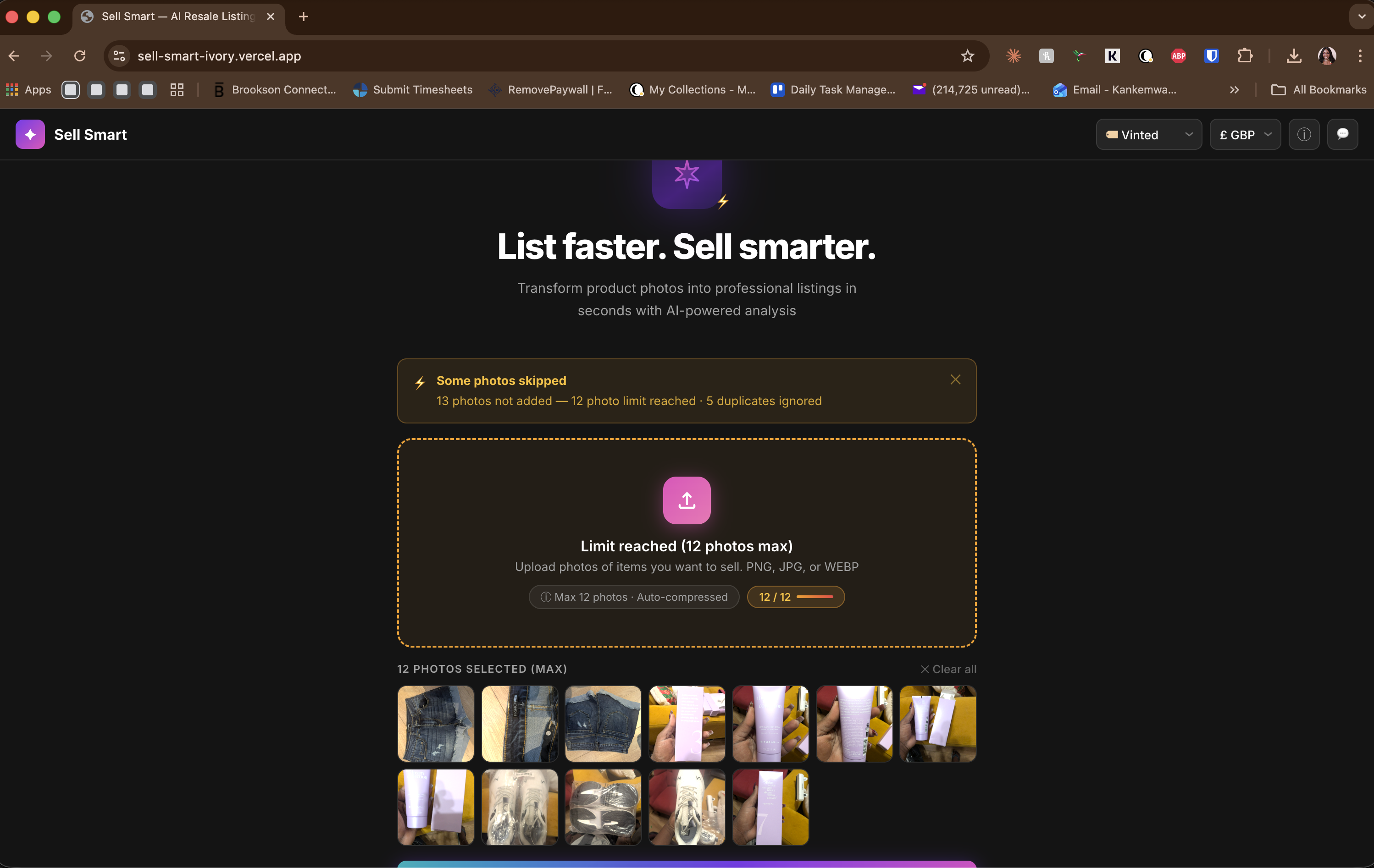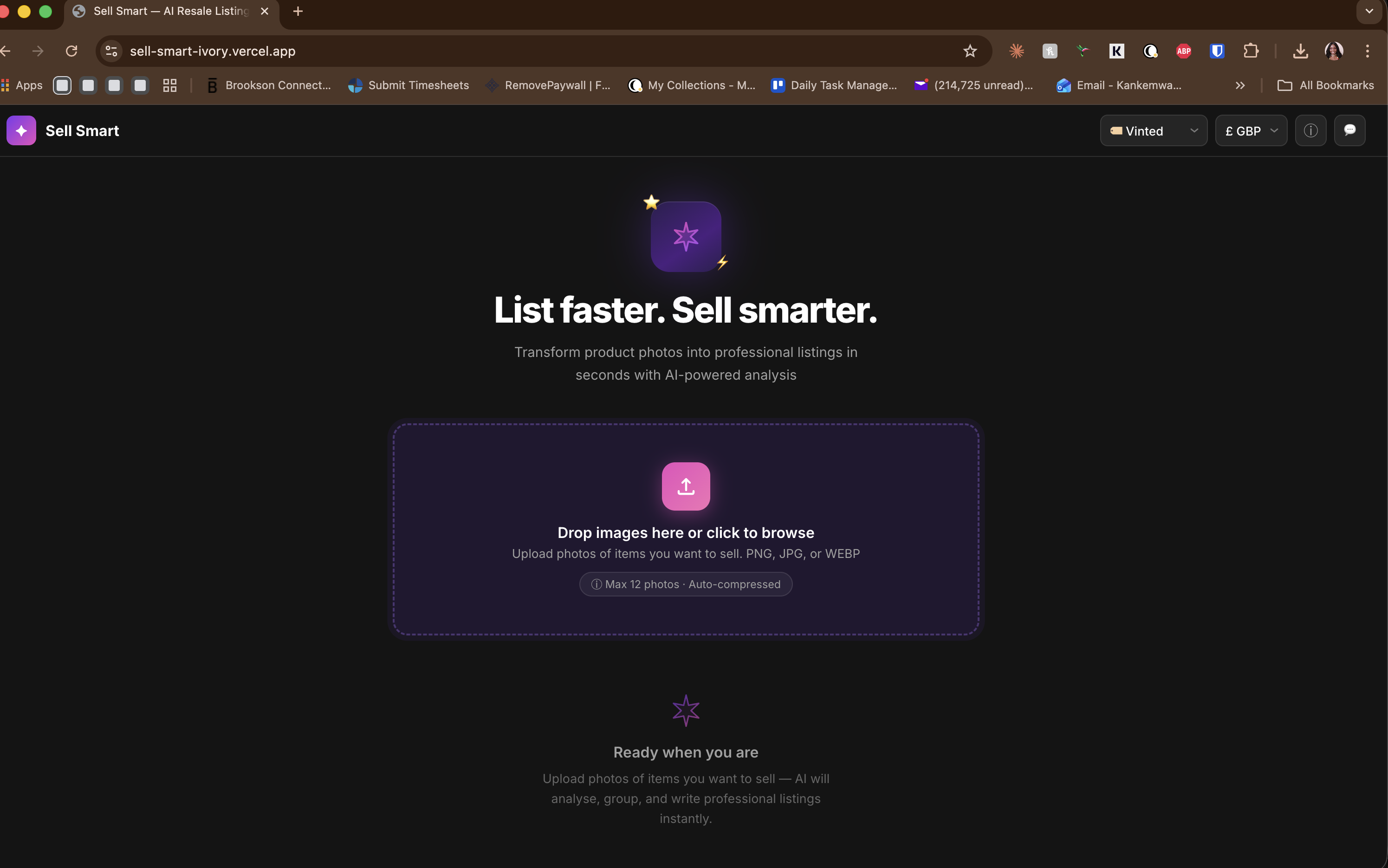 I wanted to remove that barrier entirely. The resale market in the UK alone is worth over £5 billion and growing — but the friction of listing is what stops most people from participating. Sell Smart was built to make listing as fast as taking a photo.
