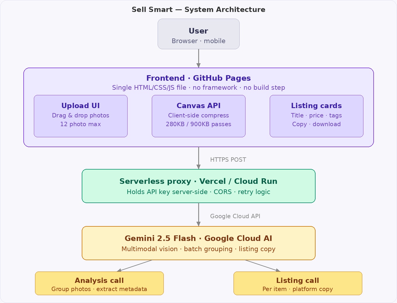 Sell Smart turns product photos into complete, platform-ready resale listings in seconds using Google Gemini's multimodal AI.
