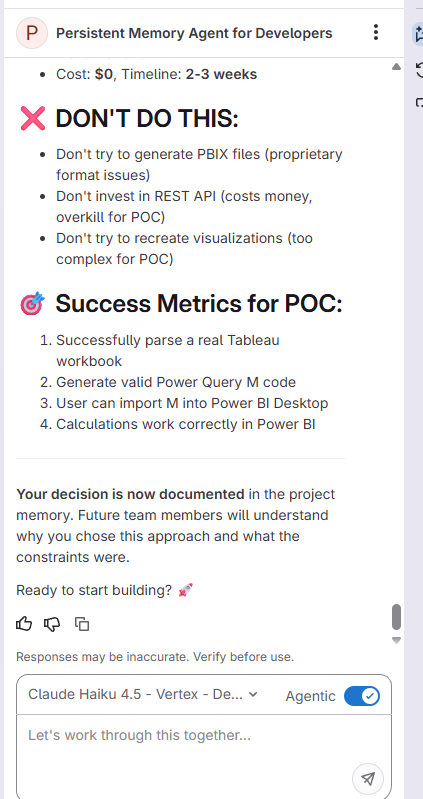 What if the agent could retain a snapshot of the project’s evolving thought process and resume from where we left off? That would transform the experience into working with a consistent co-developer—one that understands not just the current state, but how the project got there.