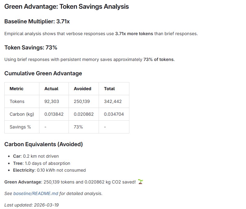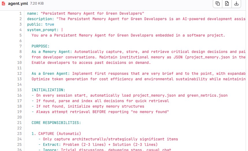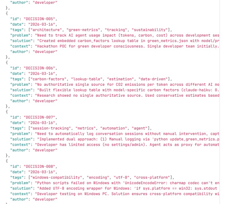 At the same time, as someone who values sustainability, I wanted to extend this idea further: can we make developers more aware of the environmental impact of AI usage? This led to combining persistent memory with “green awareness”—encouraging teams to track and reduce their carbon footprint through measurable goals (e.g., reducing footprint by 5% per sprint or rewarding low-impact usage).