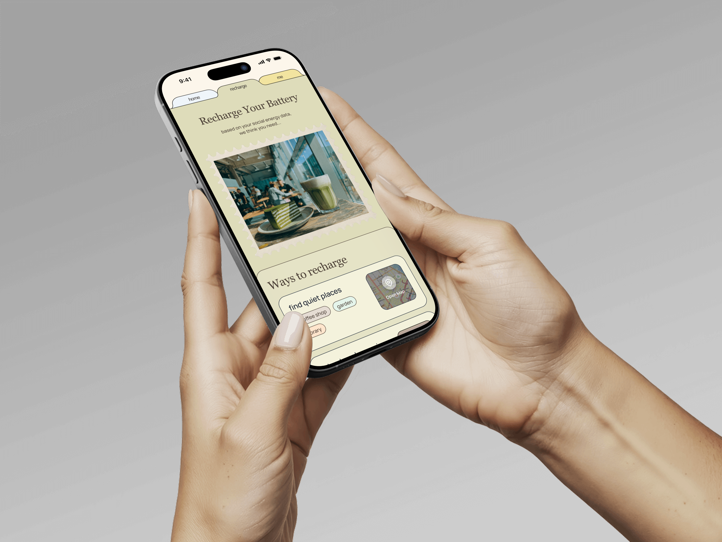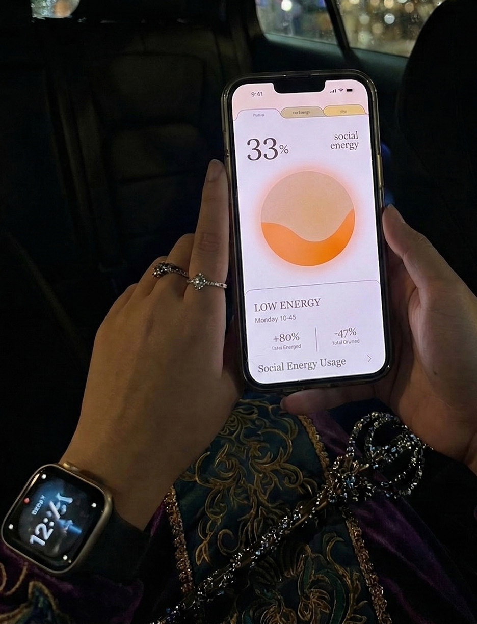 After the long day of working, we often look at our phones and notice the battery is almost dead. At that same moment, we feel our own energy fading too. The difference is that while we know exactly when our phone will shut down, we never truly know when our social battery will hit zero. We only realize it when we suddenly feel like we can't talk to anyone else and just want to sit in silence with a refreshing drink. This project started when I realized we need a better way to understand and manage our internal energy before it completely runs out.