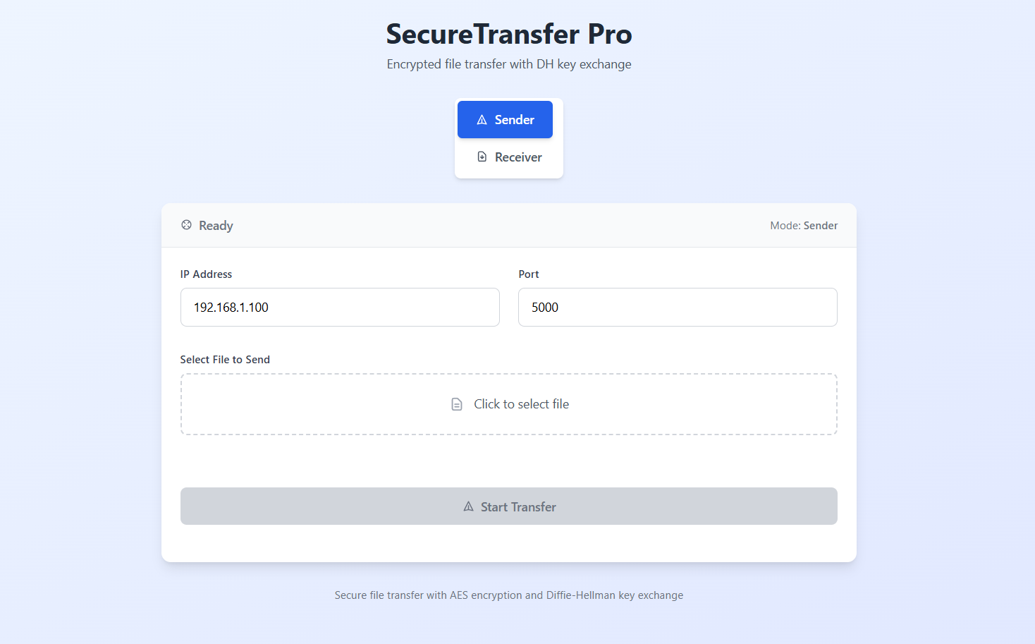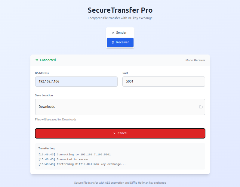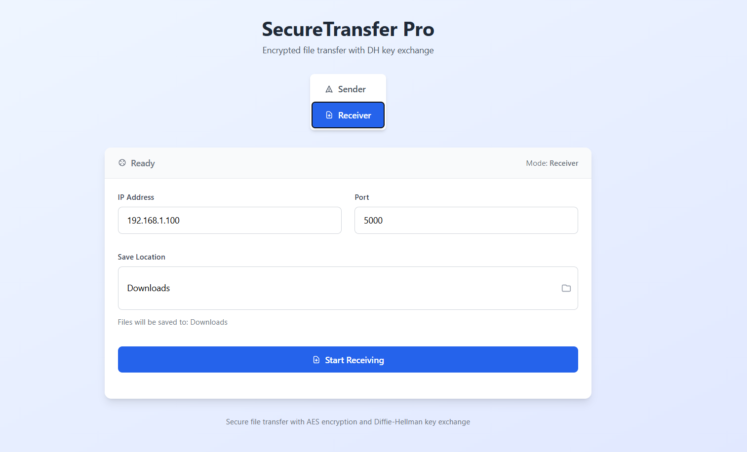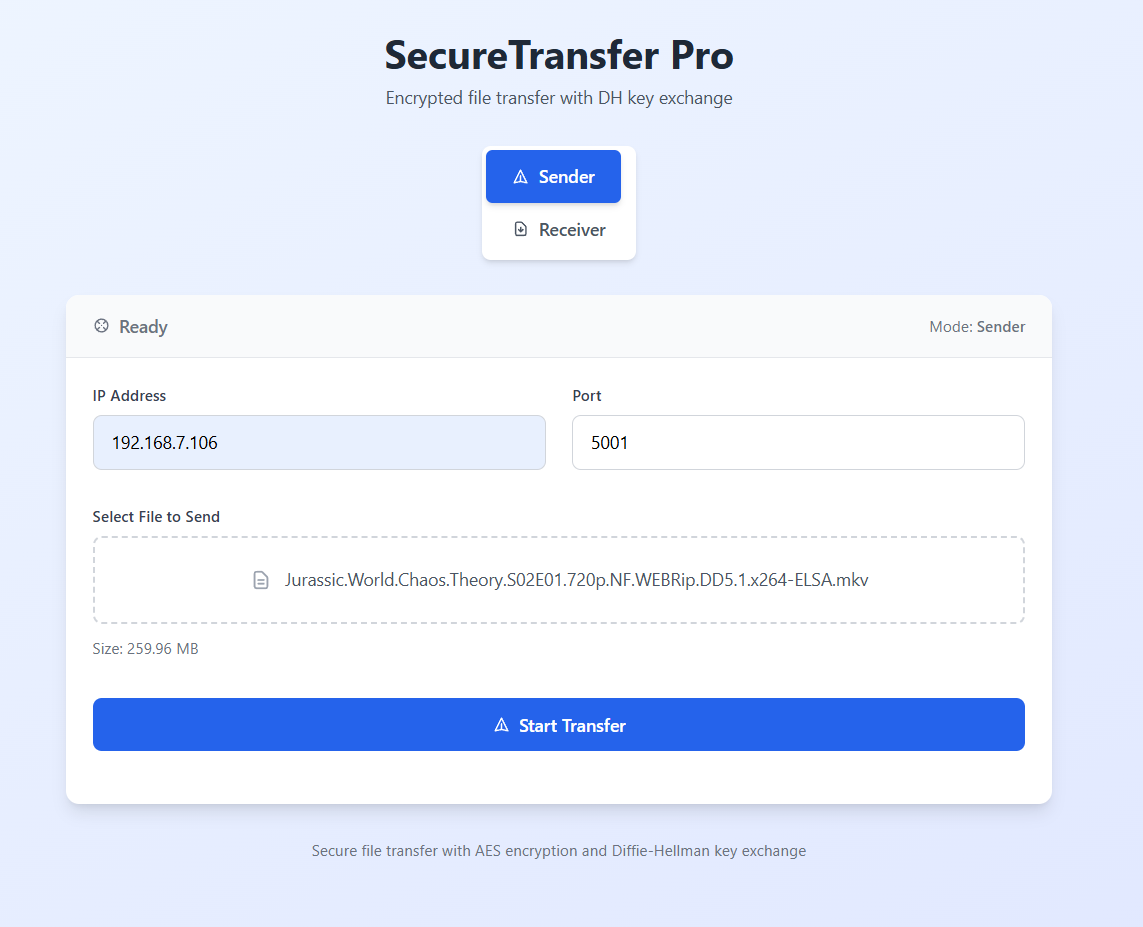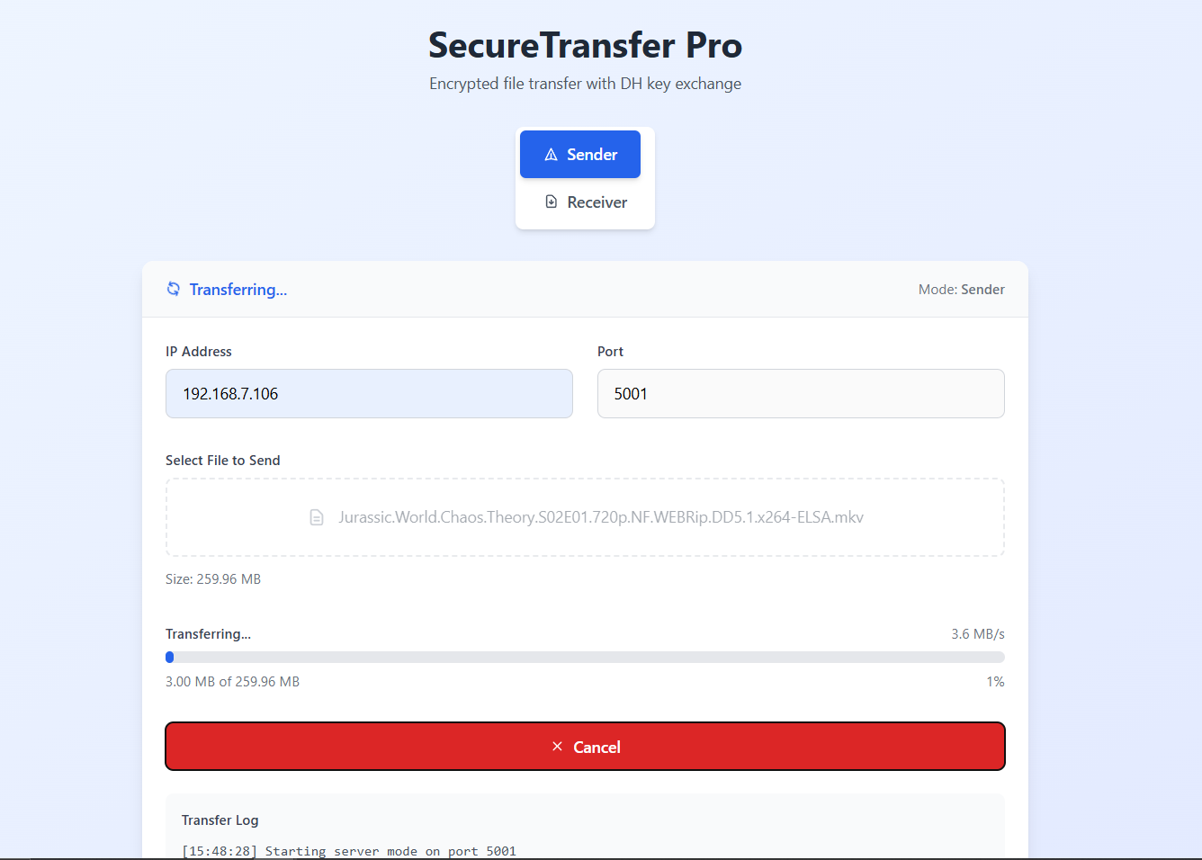 SecureTransfer Pro is a peer-to-peer, secure file transfer system designed to operate between two devices over a local network. It enables a sender to transmit large files (e.g., movies, datasets) to a receiver using: