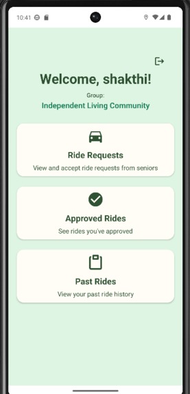 A unique group code system allows seniors to connect only with trusted volunteers, family members, or community organizations. For example, a senior can join a “Community Center” or “Church Group” using a shared code, ensuring that their rides are always handled by familiar and verified volunteers.