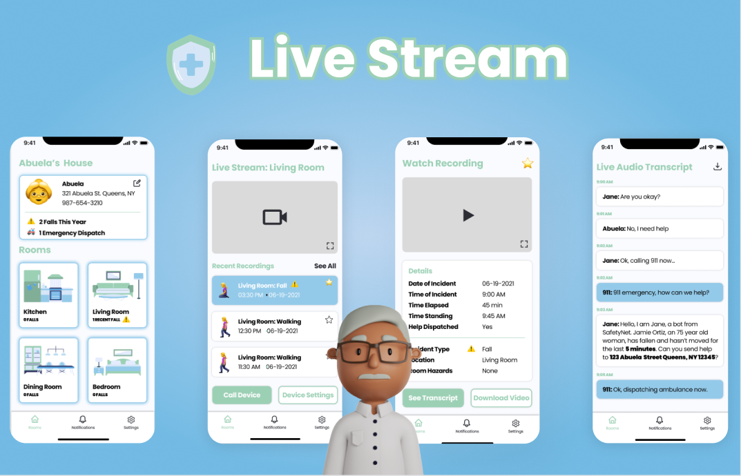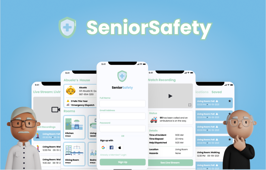 - Solution: A mobile application that once connected to local camera/webcams can detect falls, contact 911 & loved ones, as well as documentation of the fall.