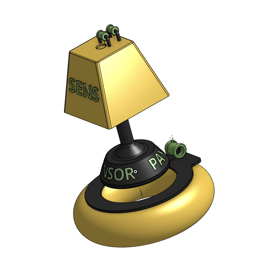 The full SENS Pod consists of a buoyant outer hull that houses all electronics and power systems above the waterline. The hull is designed to be positively buoyant at all times, ensuring the pod remains stable on the surface regardless of payload weight below.