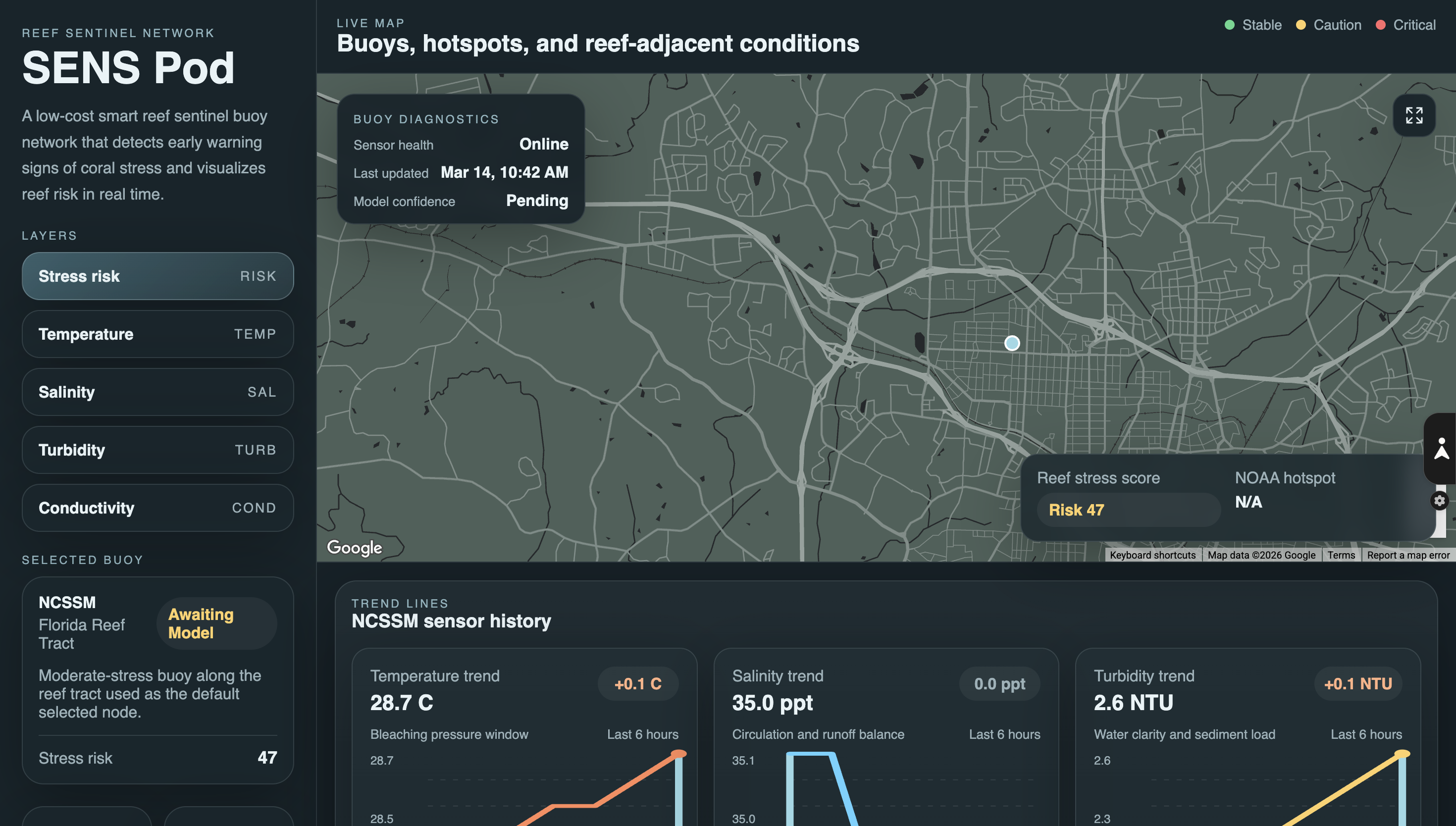 SENS Pod is an integrated hardware-software solution featuring a network of buoys that float on the ocean surface and deploy a sensor array to multiple depths via a winch mechanism, capturing a full vertical profile of the water column above a coral reef. The nature of SENS Pod's scalable mesh network enables real-time environmental data acquisition across a distributed array of buoys spanning large reef ecosystems simultaneously. A interactive interface allows users to access and analyze live telemetry, visualize sensor readings across a geographic map, and view machine learning-driven predictions of reef health scores across monitored zones.