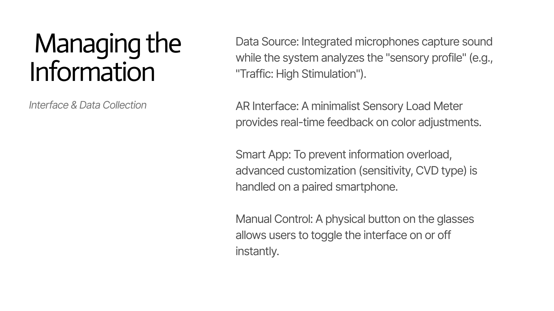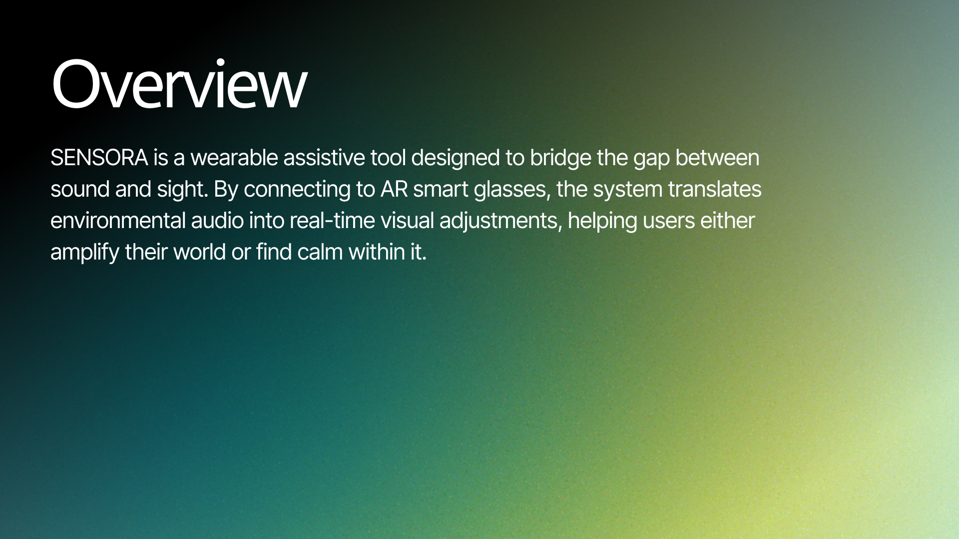 Sensora is a new way to move through the world with clarity and comfort. It’s a mobile companion app paired with AR smart glasses that gently reshape how you experience your environment. Using cross‑modal perception, Sensora listens to the sounds around you and adjusts the colours you see in real time, softening overstimulation or enhancing awareness when you need it most. The app guides you through setup, calibration, and personalized sensory modes, creating an experience that feels intuitive, accessible, and beautifully attuned to you. Sensora brings the calm glow of an aurora into everyday life, helping you navigate the world with balance and ease.