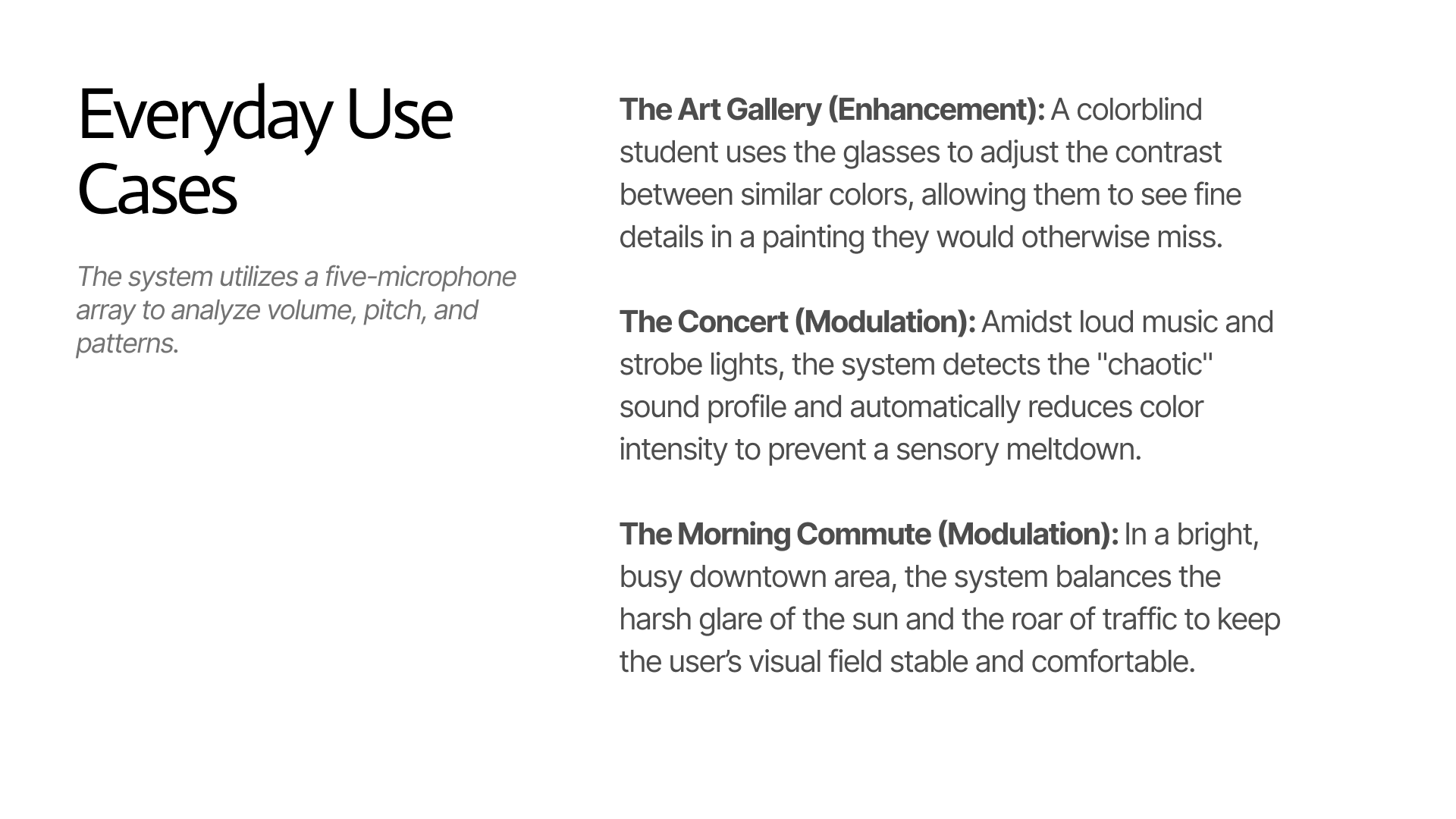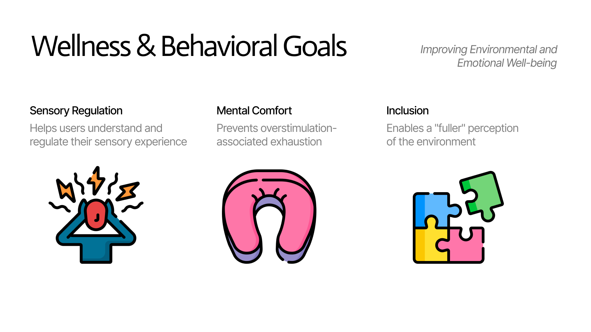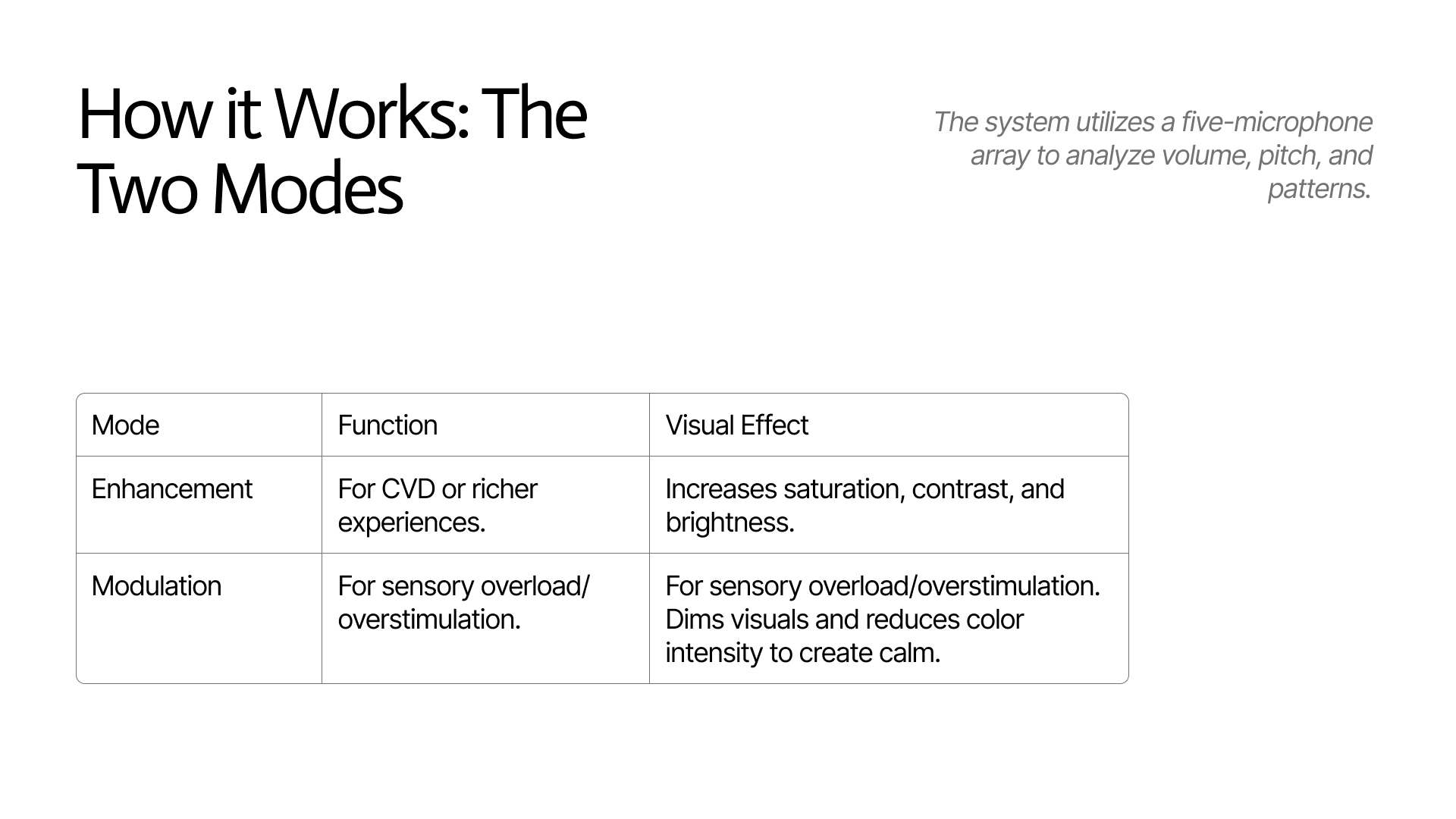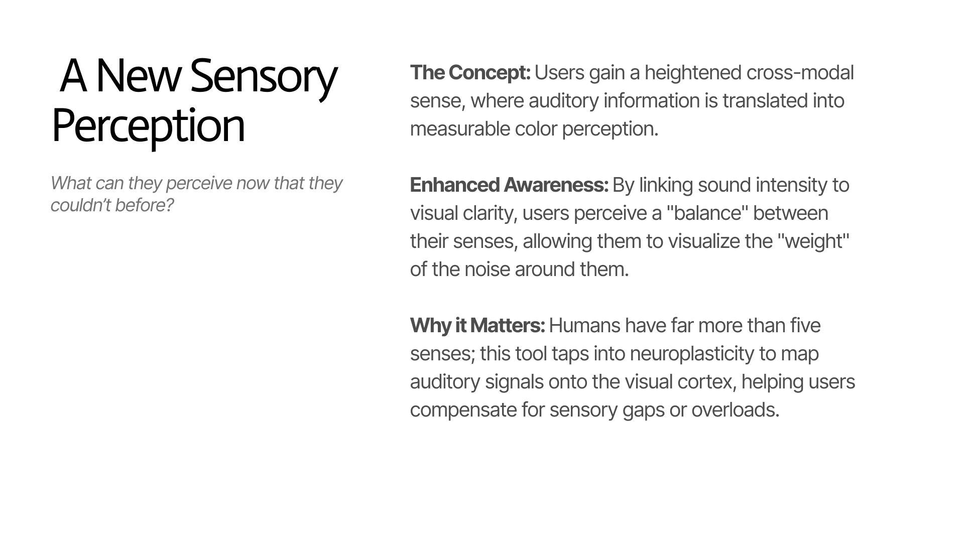 Sensory overwhelm is something many people quietly navigate every day, from neurodivergent individuals managing overstimulation to anyone trying to stay grounded in chaotic environments. We were inspired by research on cross‑modal perception, which shows that the brain doesn’t process senses in isolation. Sound can influence how we see colour, motion, and even emotional tone.
