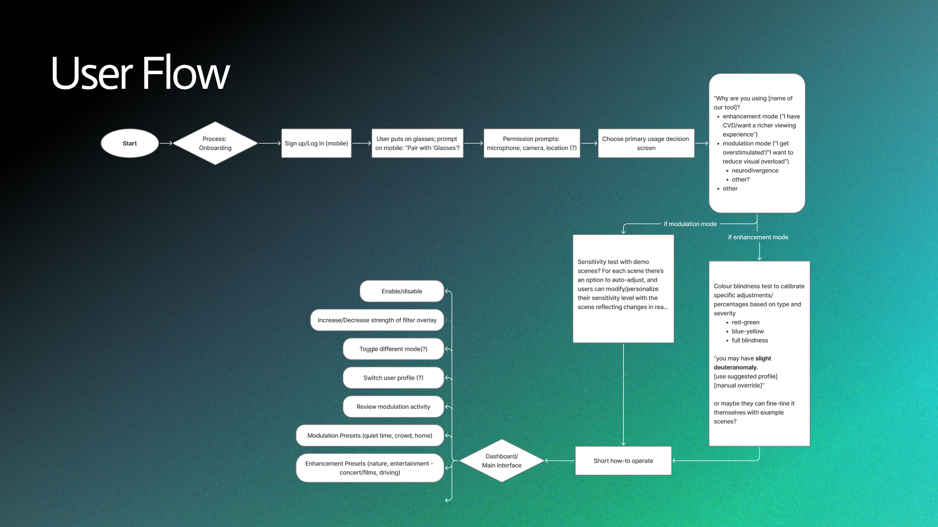 We designed the entire experience in Figma Design, focusing on calm visuals, accessible flows, and an aurora‑inspired aesthetic. Using Figma Make, we prototyped real‑time interactions and sensory transitions to validate the emotional tone early. Technically, we built an audio analysis pipeline, a colour‑modulation engine, and Bluetooth communication with AR glasses — all grounded in neuroscience research on multisensory integration.