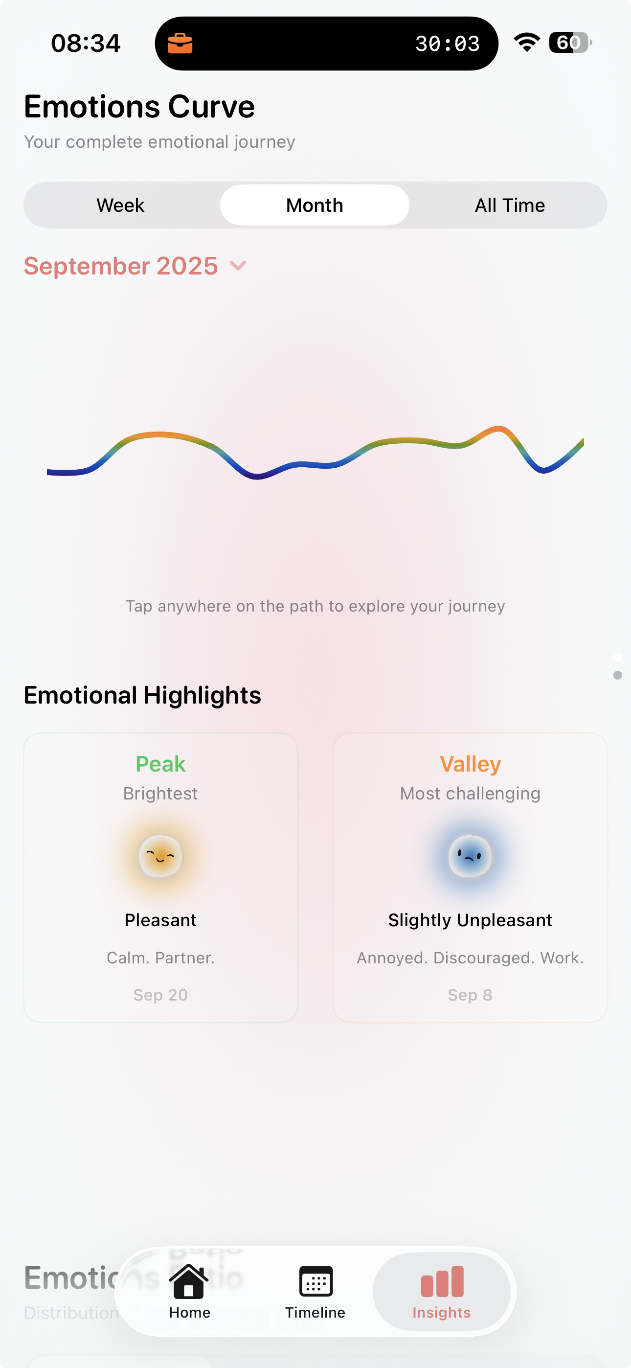 Sentimo lets you log emotions, daily reflections, and see your feelings evolve over time. It provides insights like emotion curves and balance trends to help you understand patterns and stay aware of your state of mind.