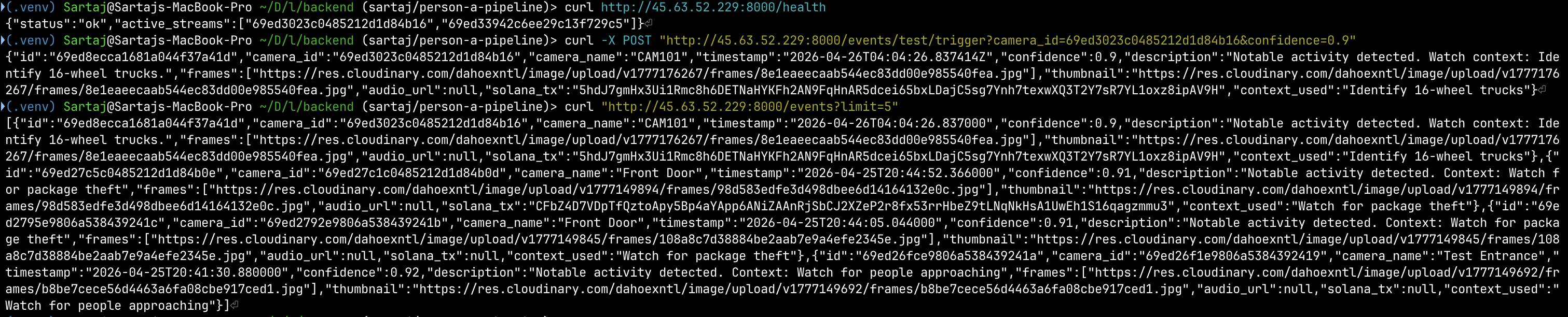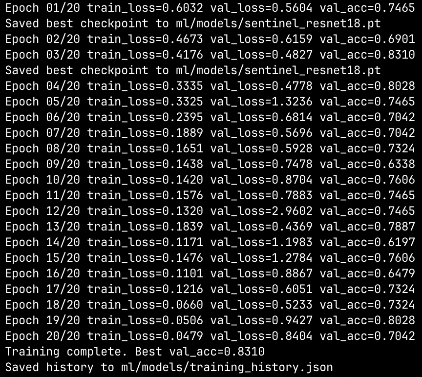 Live streams resumed automatically at startup (2 streams active in production run) Event pipeline writes to MongoDB and returns queryable history (/events?limit=5) Cloudinary frame uploads succeeded with public URLs Solana logging produced real transaction signatures Custom ResNet model training and deployment worked end-to-end (ml/models/sentinel_resnet18.pt) We also designed the pipeline so each stage can fail gracefully without taking down the entire system.