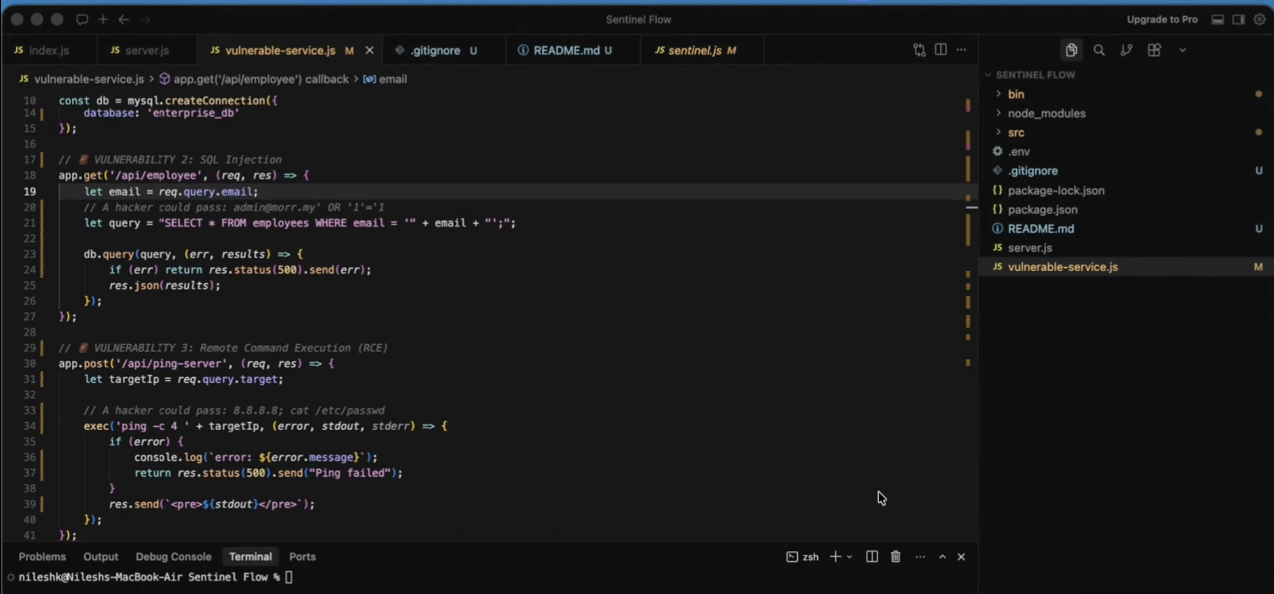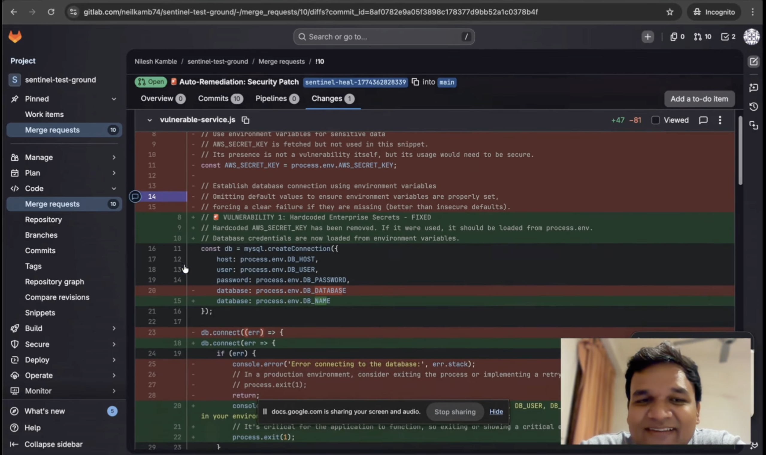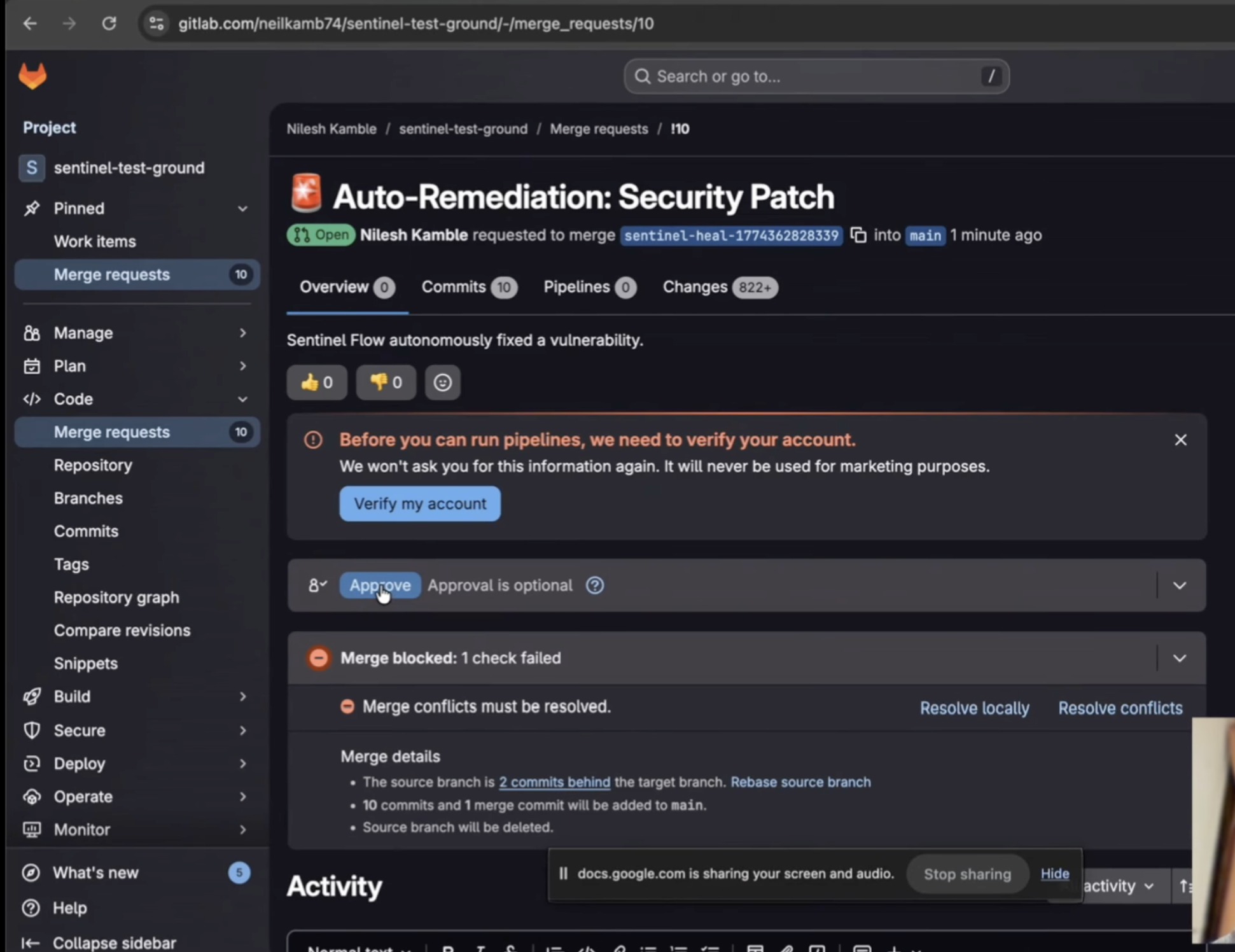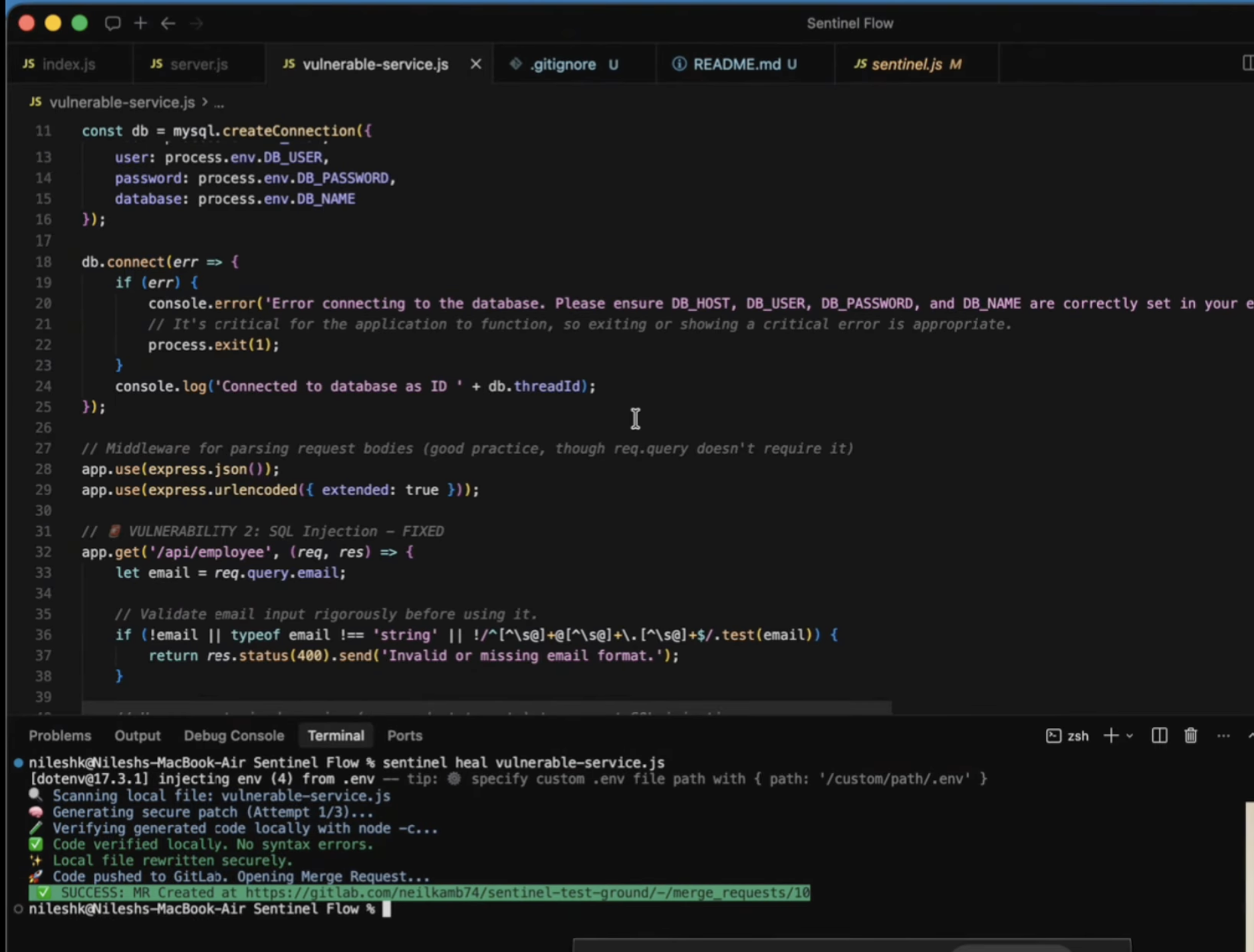 Sentinel Flow is a globally installable Node.js CLI tool. When a developer runs sentinel heal , the agent reads the vulnerable local file and uses an LLM to rewrite it securely. Crucially, it doesn't blindly trust the AI. It features a "Self-Healing Verification Loop" that runs local syntax checks (node -c) on the newly generated code. If the AI introduced a syntax error, the agent catches the error, feeds the logs back to the LLM, and forces it to fix its own mistake. Once verified, it uses the GitLab API to autonomously branch, commit, and open a ready-to-review Merge Request.