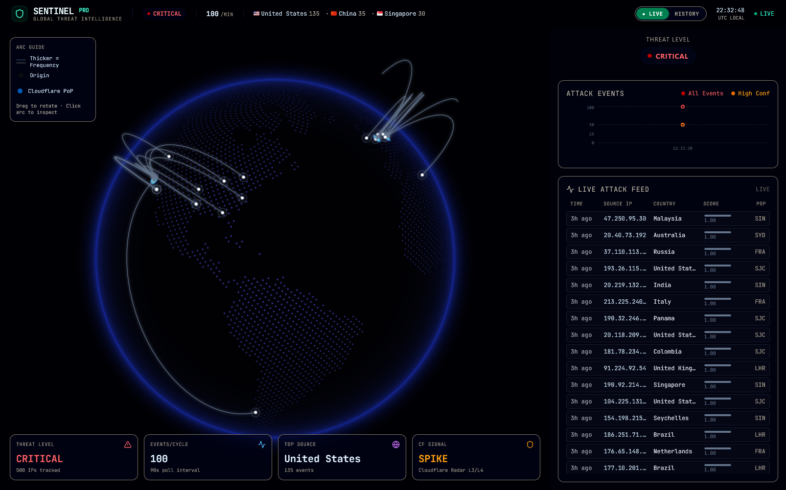 - Live Mode: Ingests live threat data, enriches it, and streams it over WebSockets to a 3D WebGL globe. You watch animated arcs fly from attacker IPs to the nearest Cloudflare Point of Presence, color-coded by attack type (DDoS, botnet, intrusion, etc.).
