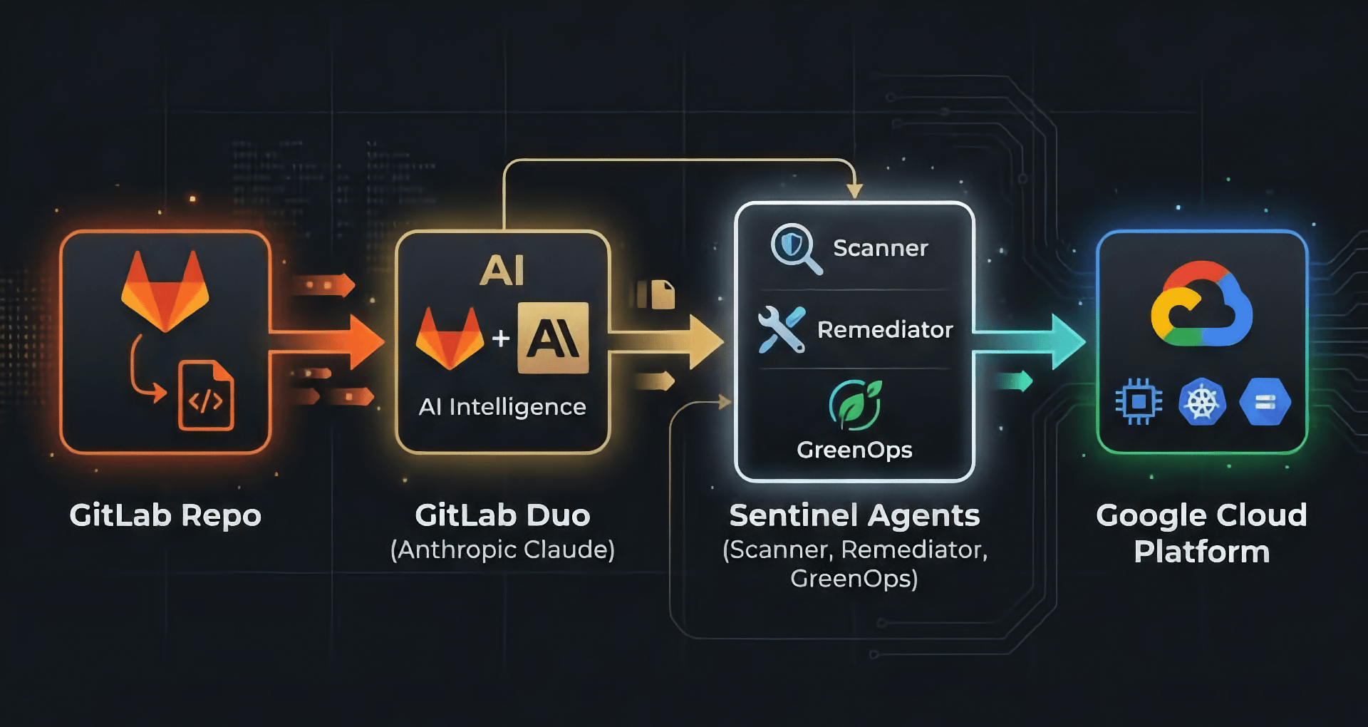 - Agent Orchestration: I designed a custom GitLab Flow that sequences five specialized agents (Scanner, Classifier, Remediator, GreenOps, and Reporter).