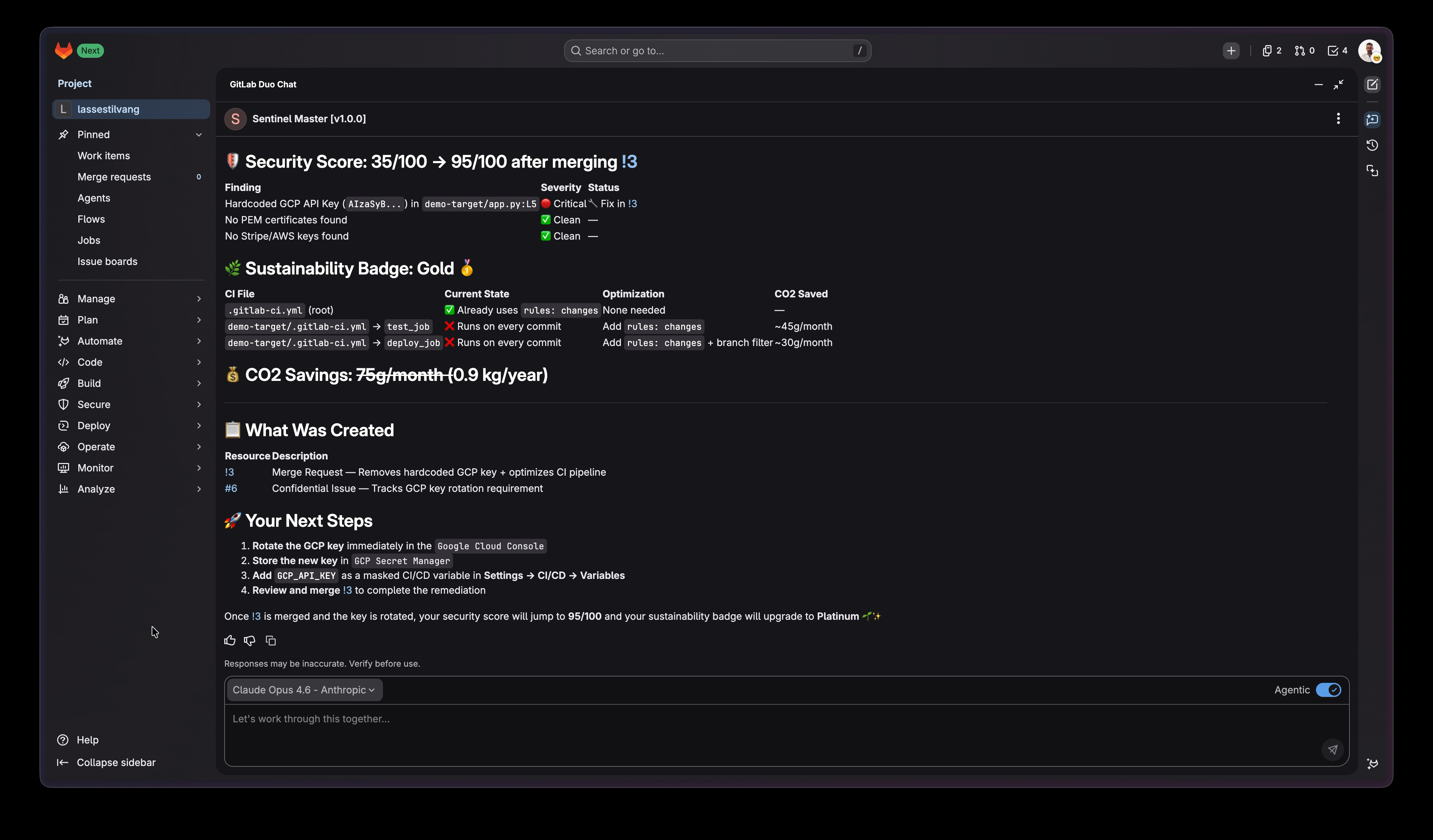 .gitlab-ci.ymlfor inefficiencies and suggests job-filtering rules (rules: changes) and caching, reducing pipeline compute waste. - Intelligence: Consolidates 5 specialized agents into one "Sentinel Master" Super Agent for a seamless GitLab Duo Sidebar experience.