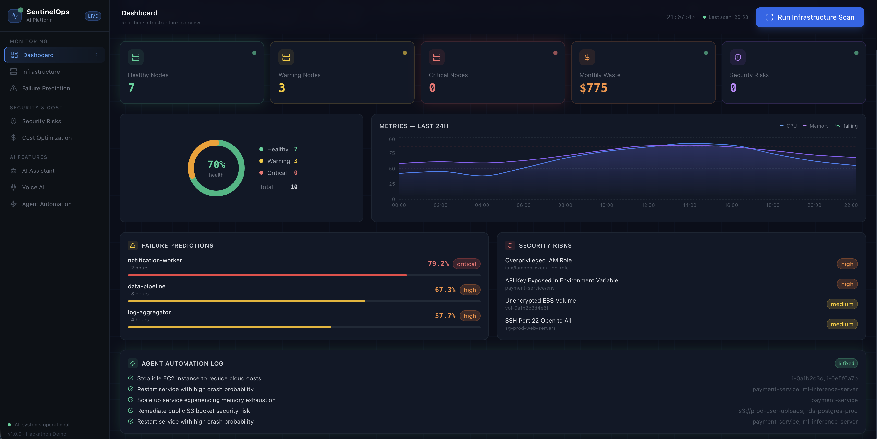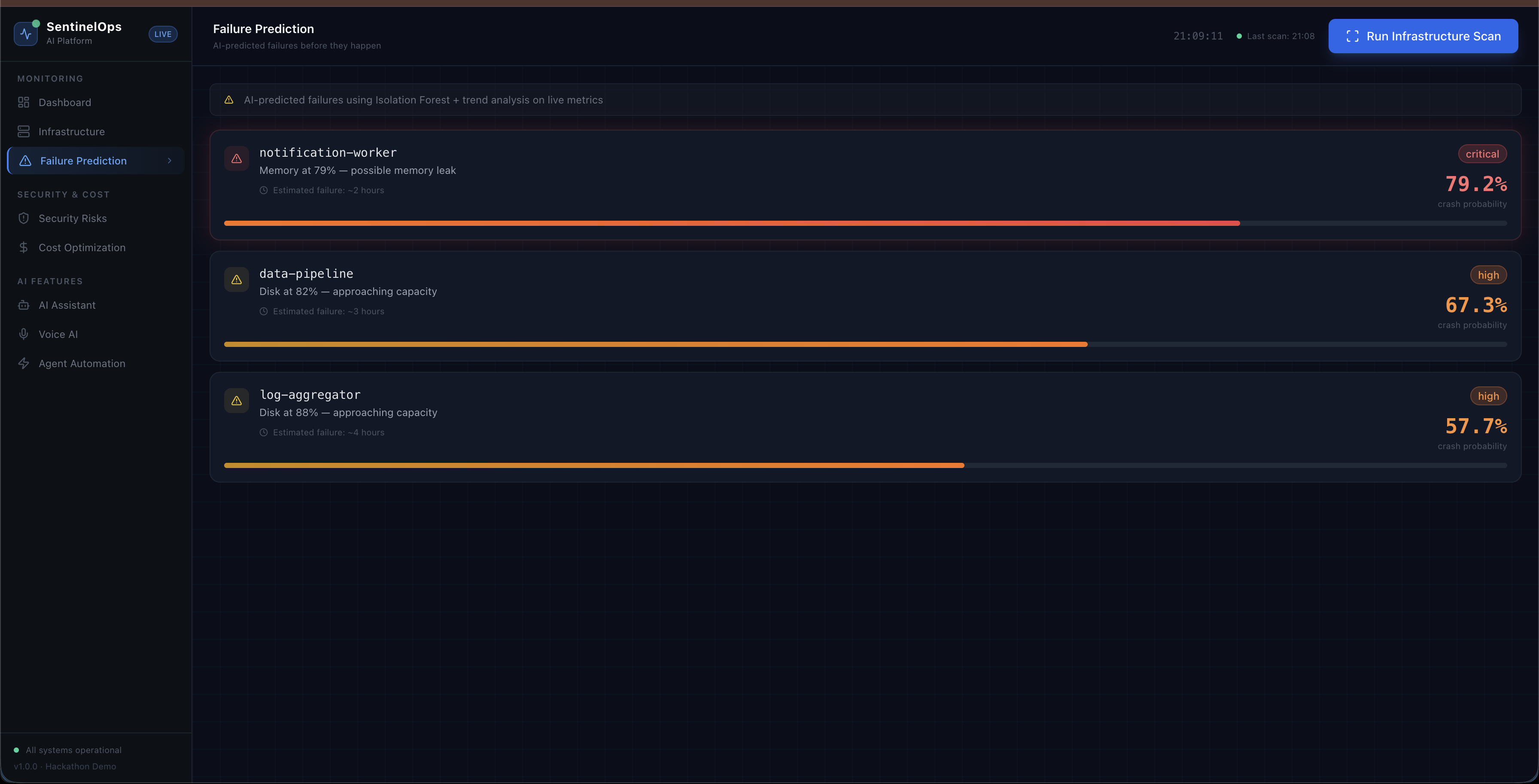 Isolation Forest models analyze telemetry patterns and forecast service failures 15–30 minutes before they occur.Security & Cost Intelligence