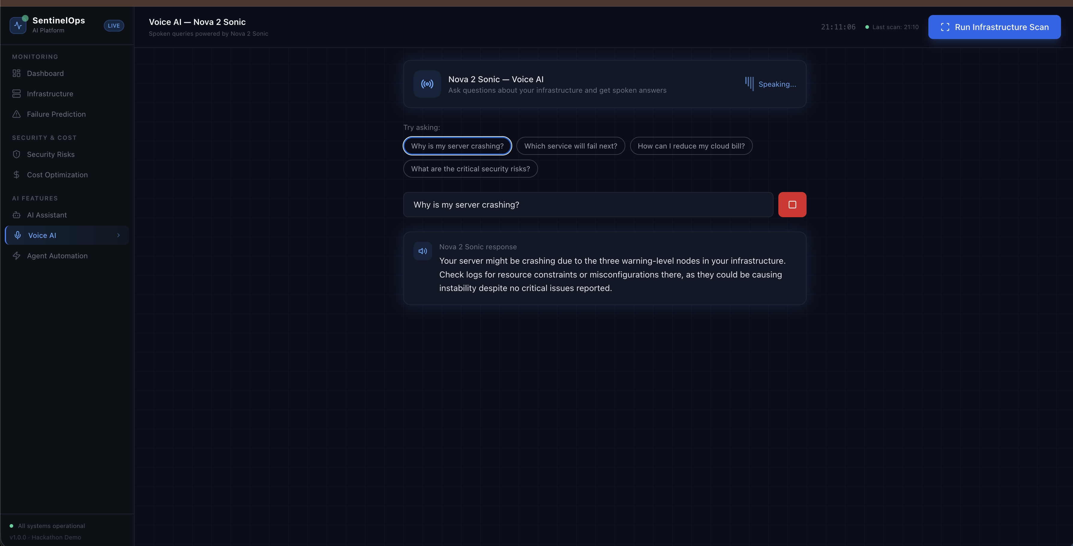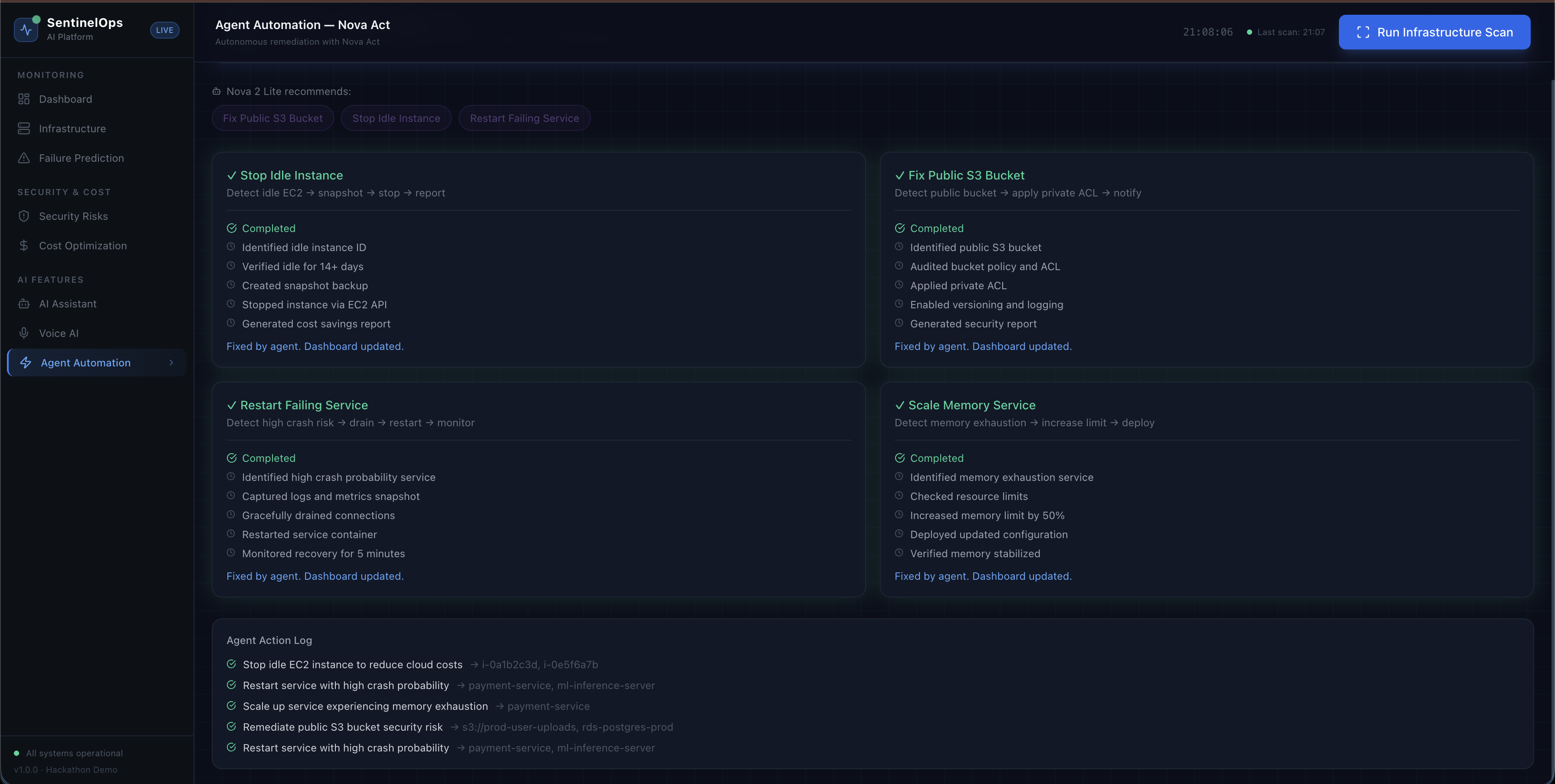 Hands-free infrastructure management powered by Nova-2-Sonic for situations when you are away from the keyboard but need immediate status.Autonomous Remediation
