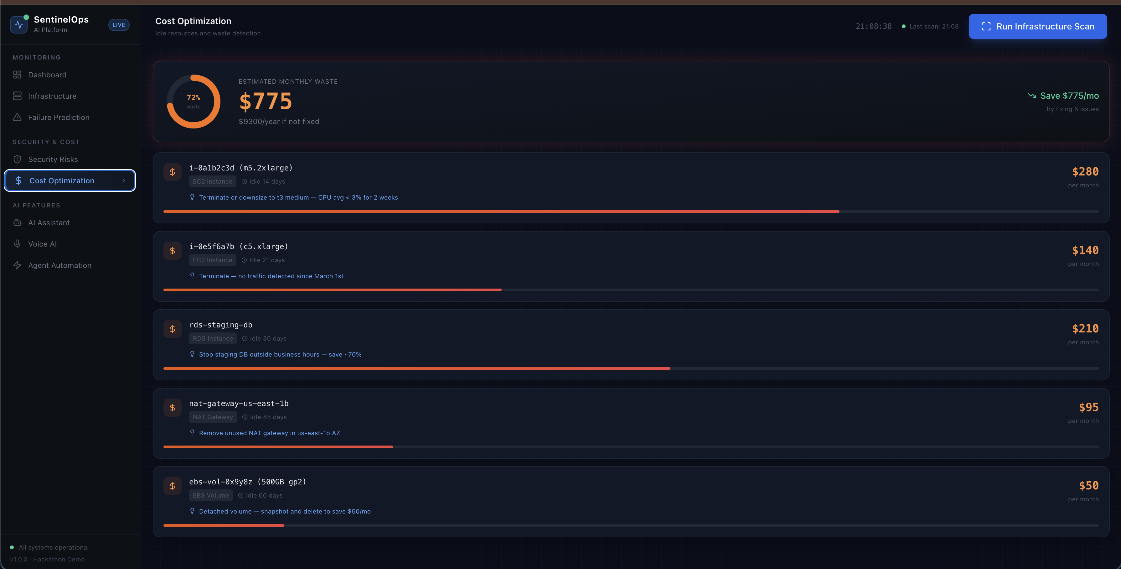 Cost Optimization: Pinpointing $775 in monthly cloud waste from idle server instances.