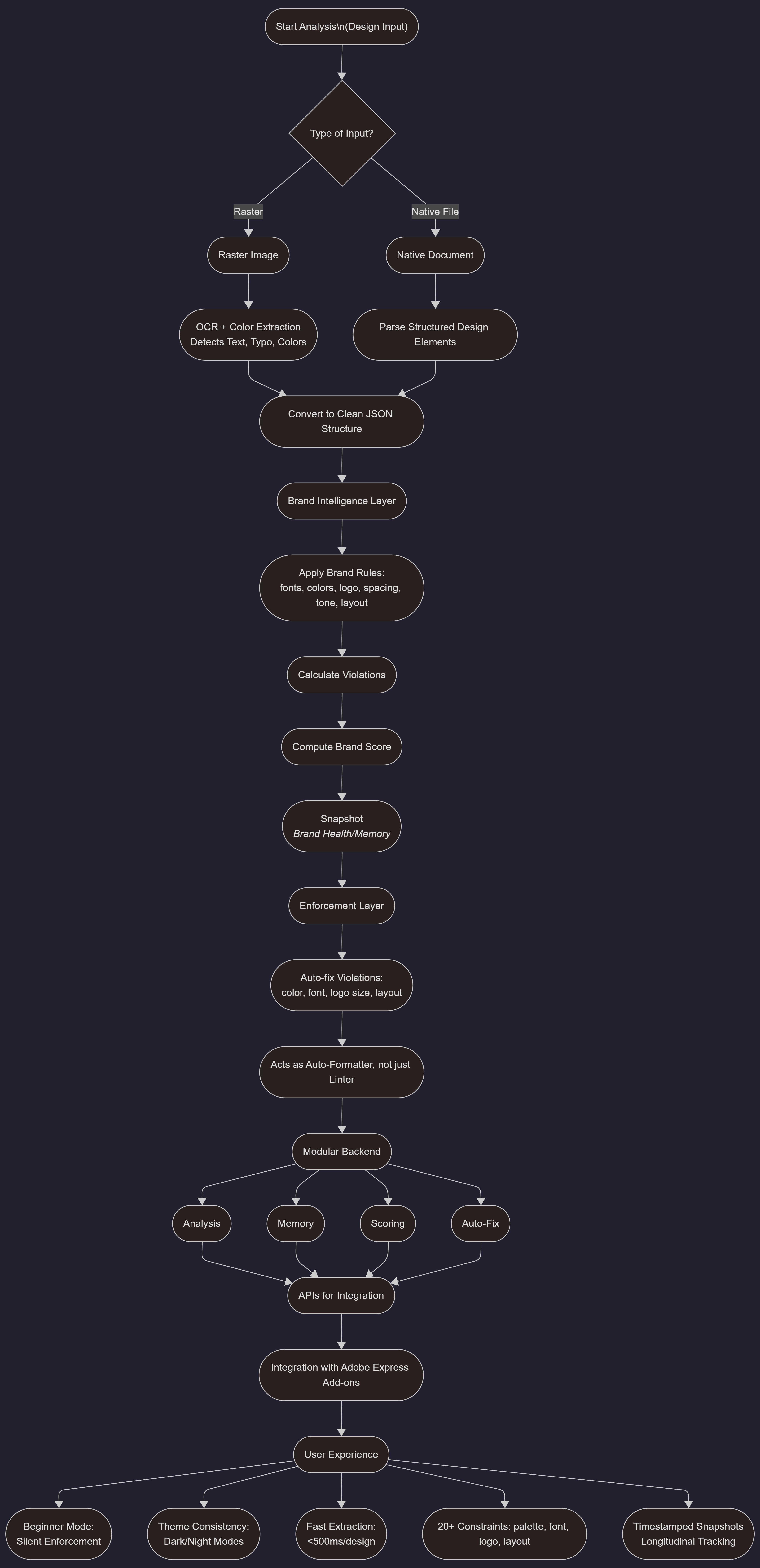 First, we focused on understanding designs the way designers do. Designs inside Adobe Express aren’t just flat images; they are structured documents made of logos, text blocks, colors, fonts, and layouts. SENTRA taps into this structure directly. For raster inputs, we use OCR and color extraction to identify text, typography, and dominant palettes. For native design documents, we read elements as structured data, converting visual decisions into a clean JSON representation that code can reason about. Next came the brand intelligence layer. We defined brand rules as machine-readable constraints - approved fonts, color palettes, logo usage rules, spacing limits, tone guidelines, and layout norms. SENTRA’s engine evaluates every extracted element against these rules, calculates violations, and computes a Brand Score using weighted penalties instead of subjective feedback. Over time, every check is stored as a snapshot, allowing us to track Brand Health and build Brand Memory - a historical record of how a brand stays consistent or slowly drifts. The third layer is what makes SENTRA different: enforcement, not just detection. Instead of stopping at warnings, we built an auto-fix engine that can correct violations automatically, snapping colors back to approved values, normalizing fonts, fixing logo sizing, and aligning layouts. This makes SENTRA behave like an auto‑formatter for design, not just a linting tool. On the technical side, the system runs as a modular backend service with clearly separated components for analysis, memory, scoring, and auto-fixing. We exposed these capabilities through clean APIs so SENTRA could plug directly into creative tools. Integrating with Adobe Express Add-ons required careful handling of sandboxed environments, local development servers, and cross-origin communication - one of the most challenging but rewarding parts of the build. Throughout development, we constantly optimized for non-designers. We added a beginner mode that enforces brand rules silently in the background, allowing teams to move fast without ever worrying about breaking brand identity. Even features like dark and night theme consistency were built with real-world usage in mind. Our extraction pipeline processes a typical design in under 500ms, converting visual elements into structured data without noticeable lag inside the editor. The brand rule engine currently supports 20+ enforceable constraints, including palette tolerance, font hierarchy, logo spacing ratios, and layout thresholds. Each SENTRA check generates a timestamped snapshot, enabling longitudinal tracking across dozens of designs per brand.