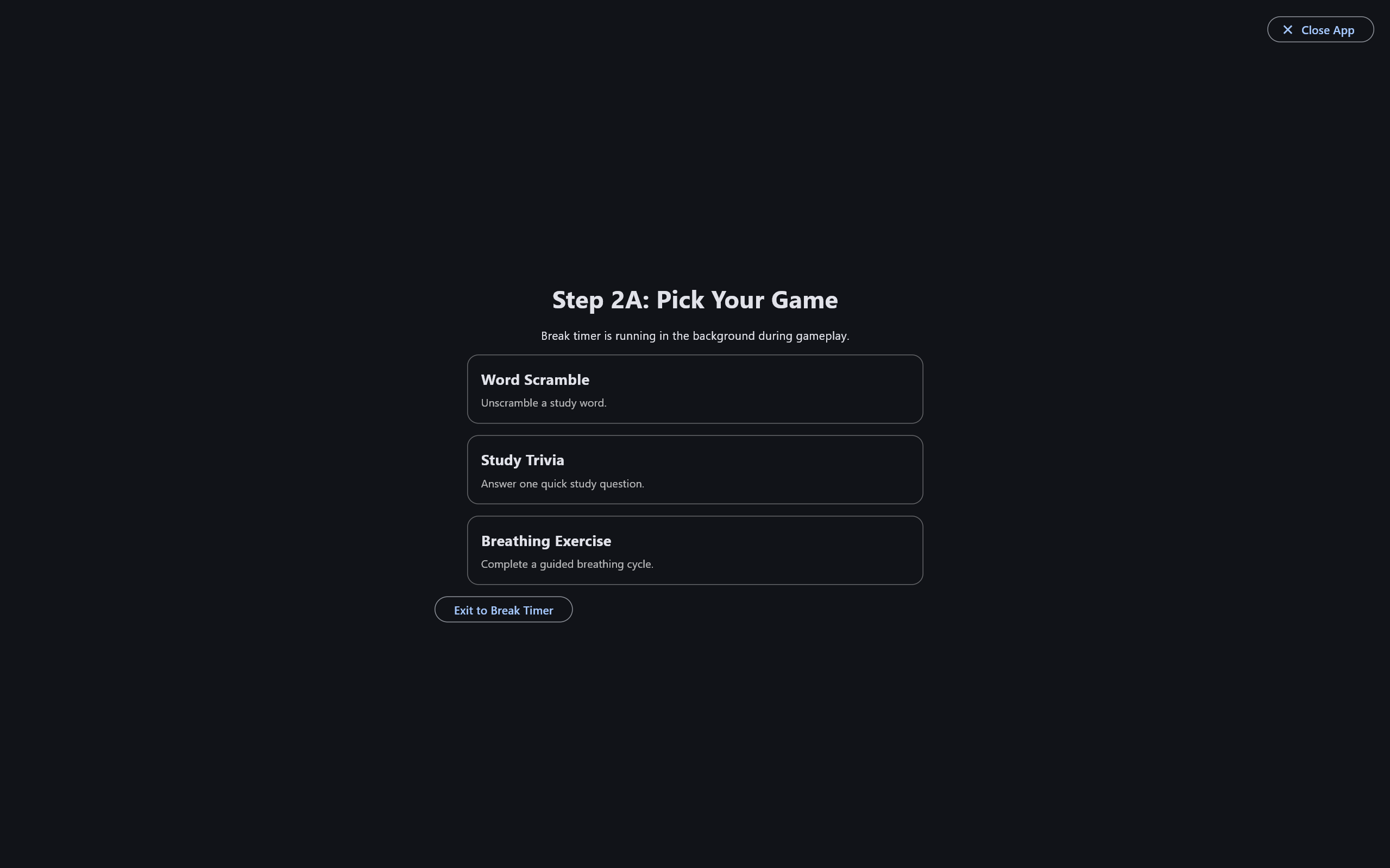 - Adaptive break flow — schedules breaks dynamically based on your focus score, with gamified break activities and streak shields