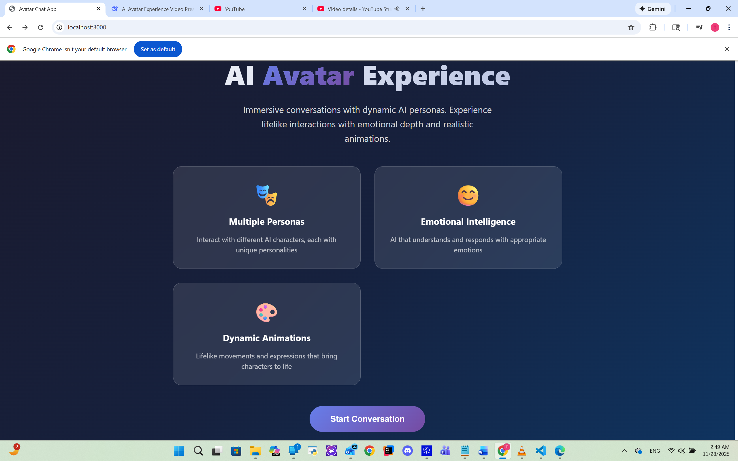 I noticed that most AI chatbots feel cold and impersonal—they respond with perfect logic but lack the emotional intelligence that makes human conversations meaningful. I wanted to create an AI that doesn't just understand words, but understands feelings and responds with genuine emotional presence.