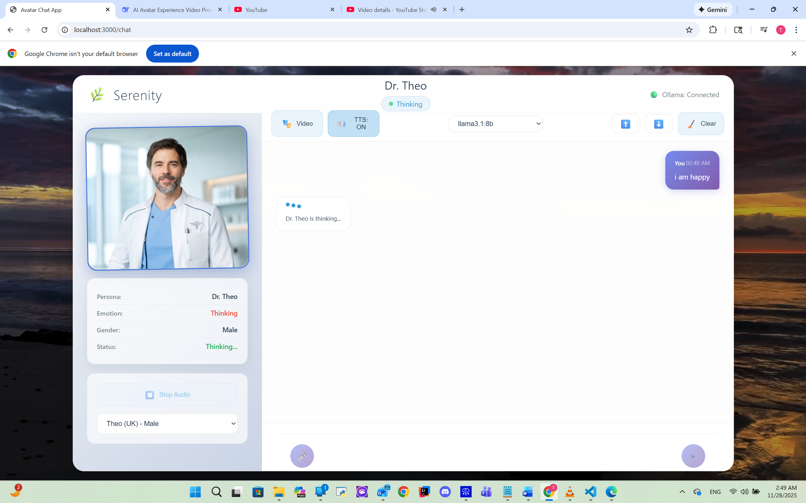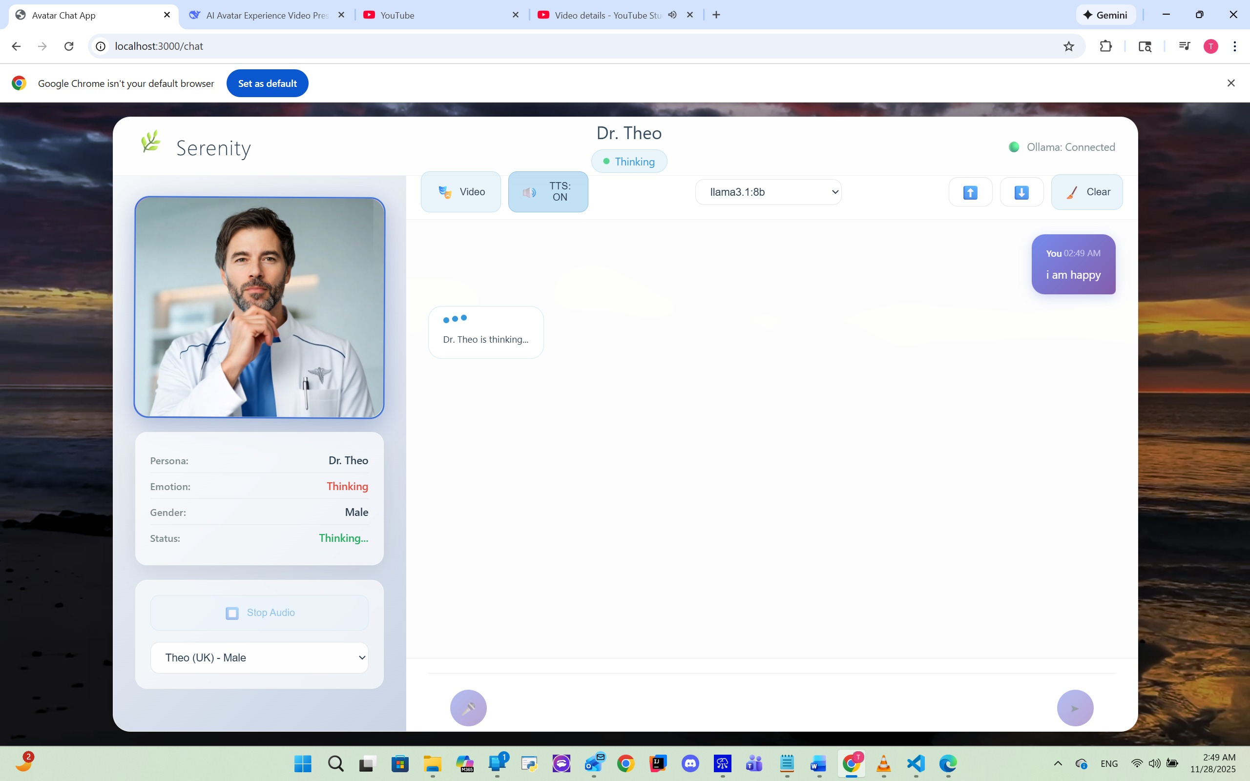 Serenity is an immersive AI avatar experience featuring lifelike emotional avatars that express 15+ distinct emotions in real-time. It offers multiple AI models (Llama, DeepSeek, Mistral) with unique conversational styles, gender-specific personas with matching voices and animations, and real-time emotion detection that creates truly human-like interactions.