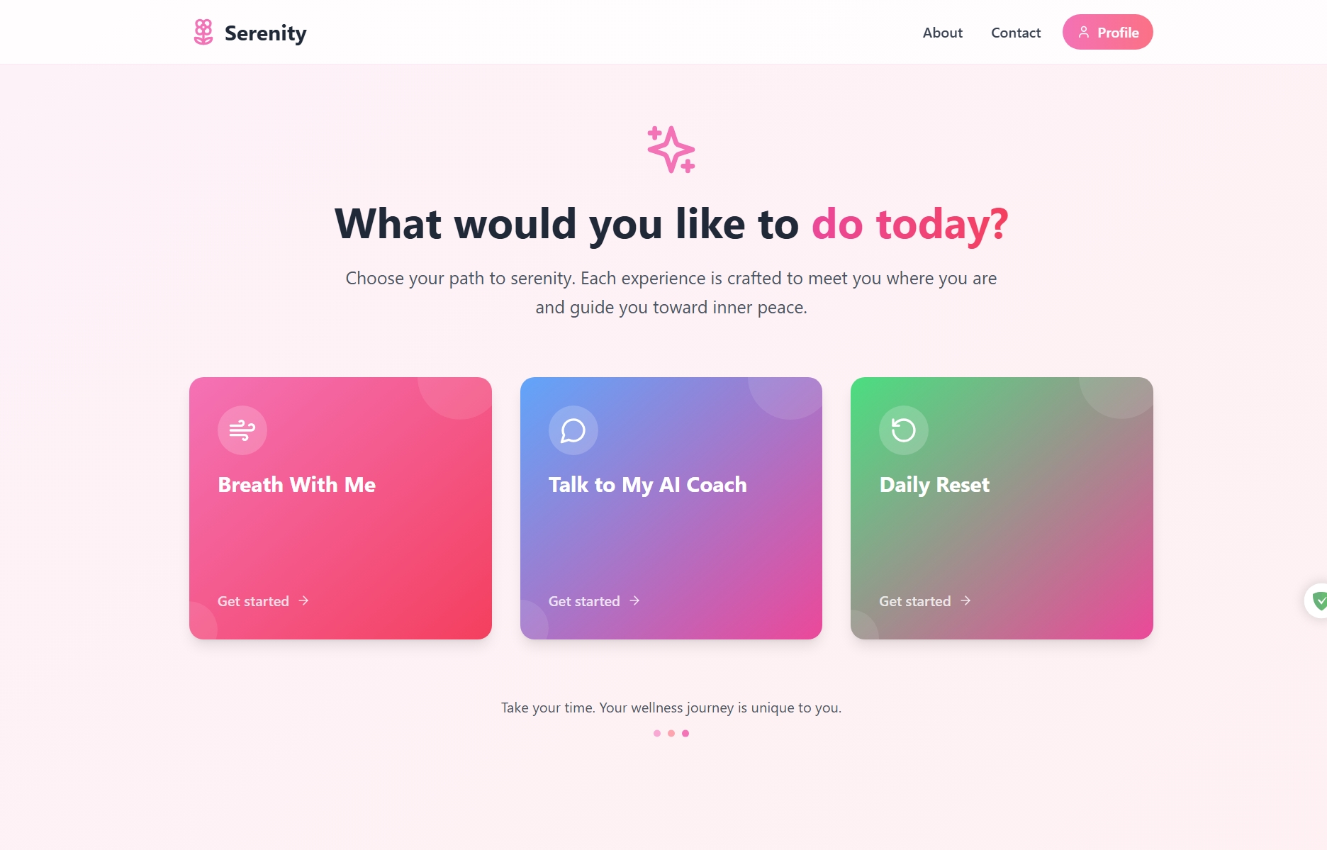 That’s how Serenity was born—a calming space guided by a conversational AI that helps users reset, refocus, and reconnect with themselves through guided breathing and gentle check-ins.