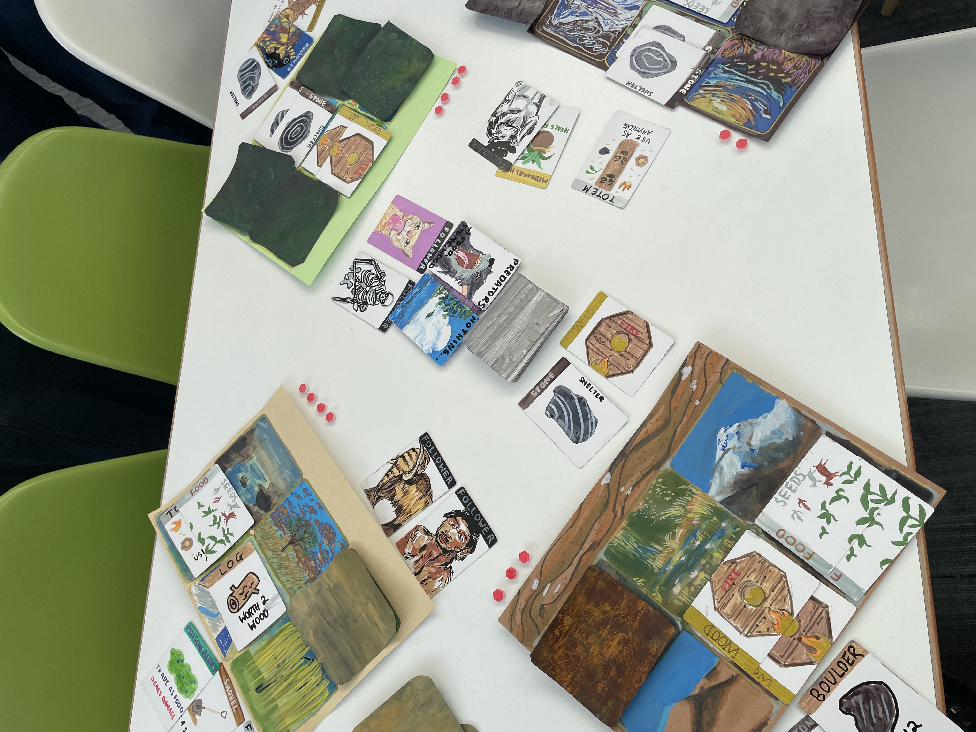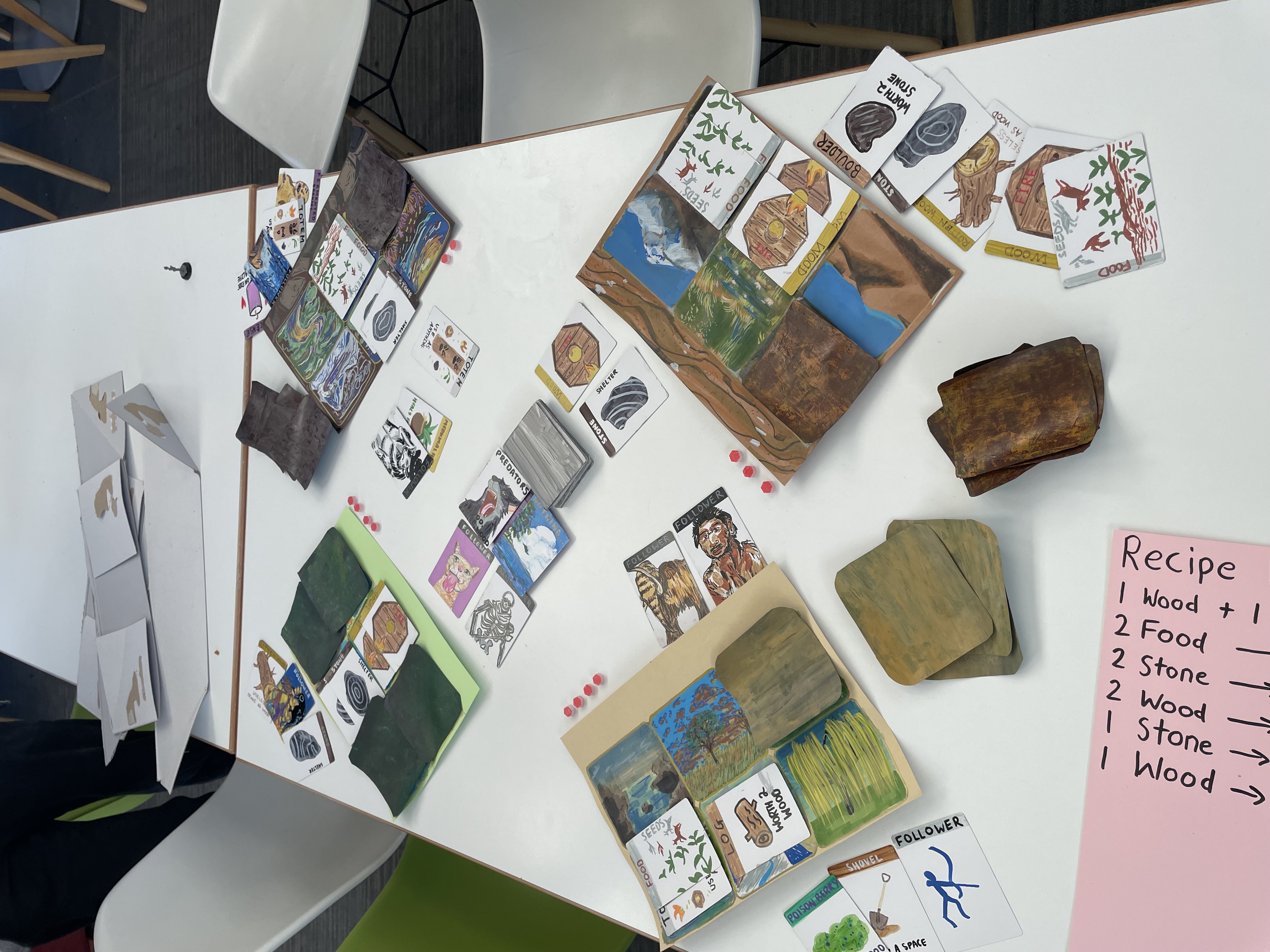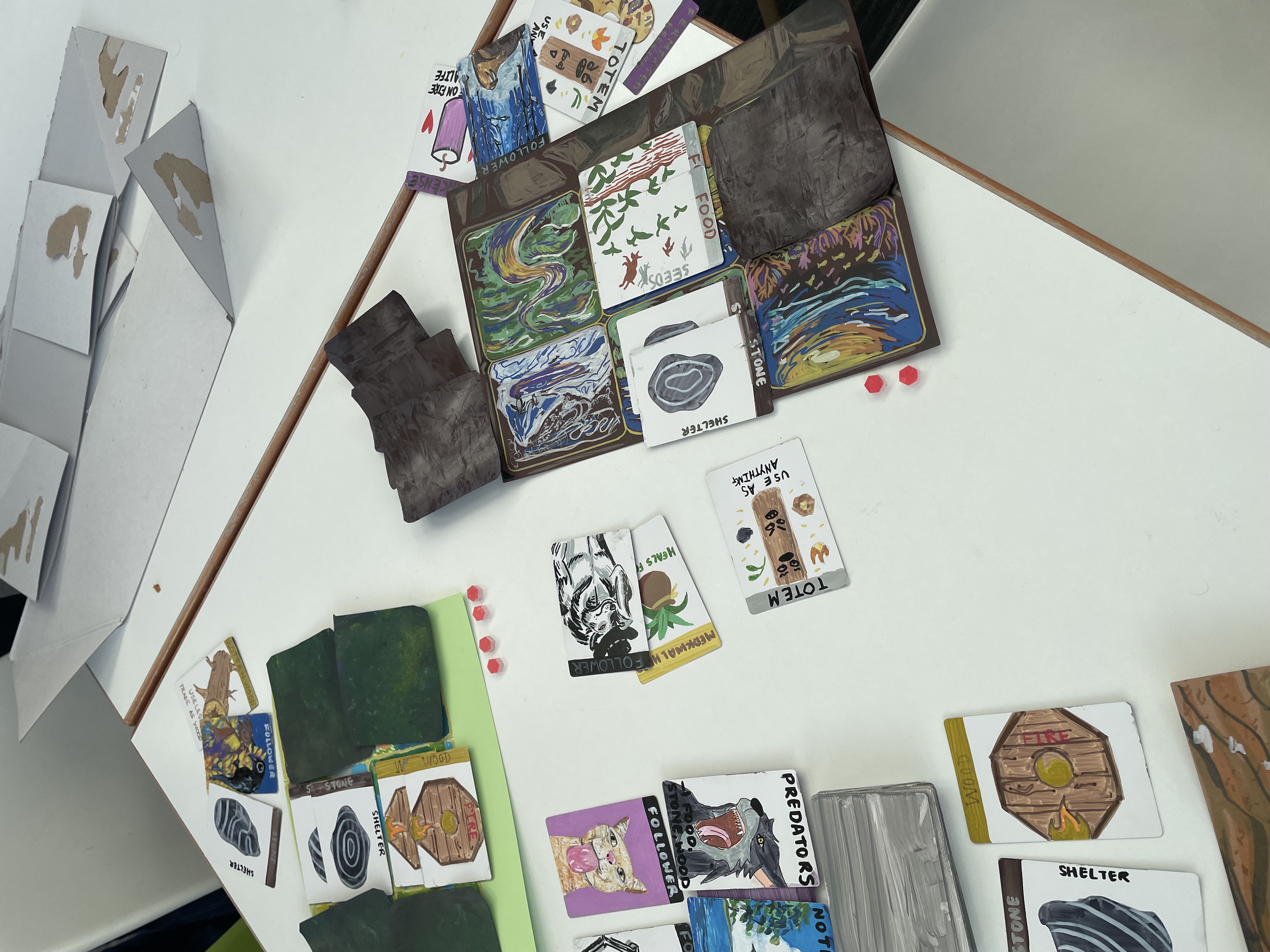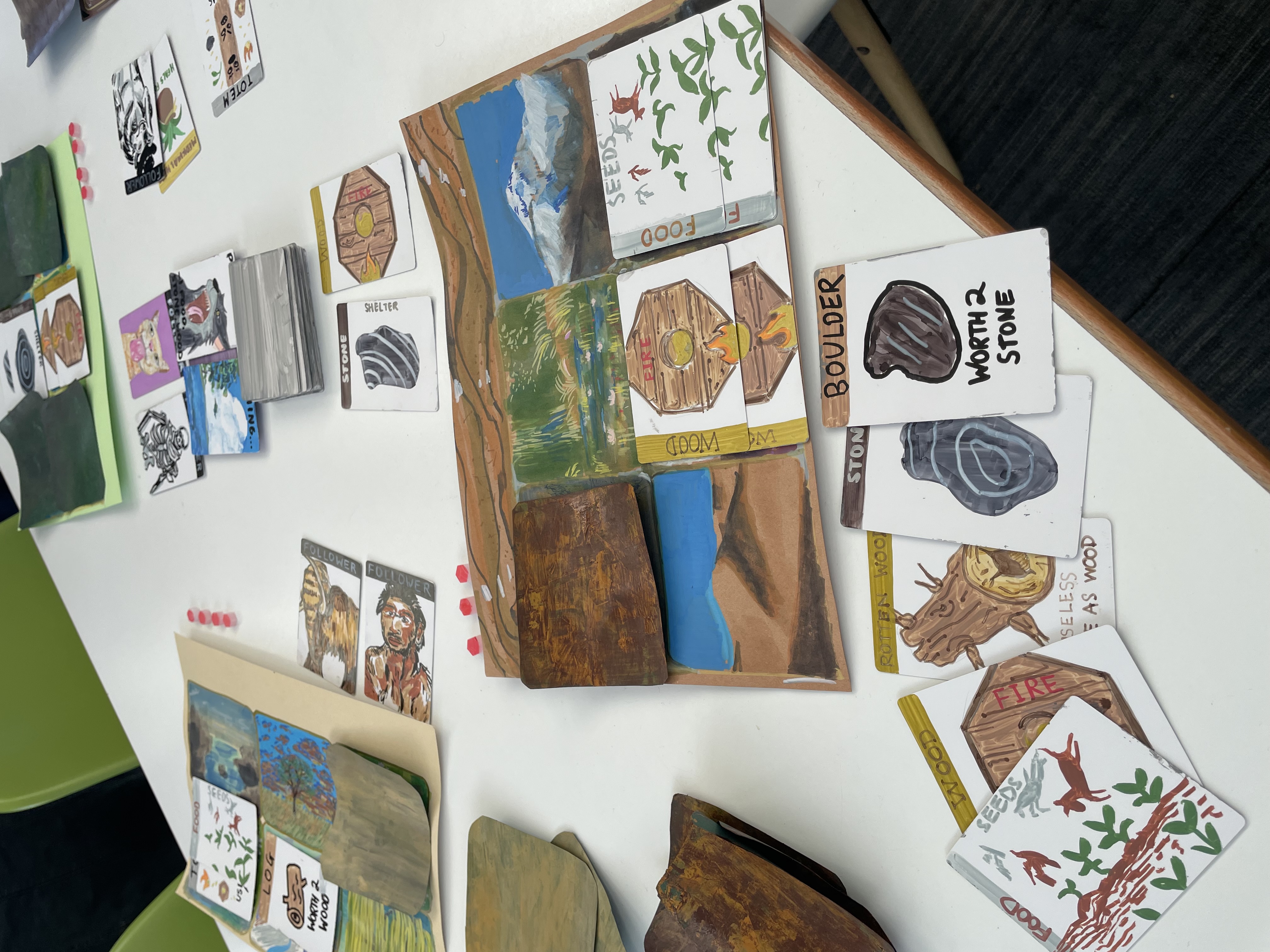 We drew around 100 cards of characters and events. Every card was hand-drawn, with basic resources such as food, stone and wood having similar basic designs, with special features such as putting together two woods made a picture of fire. Other cards were more special. Followers, which are used to attack other players were each uniquely drawn, and although generally stone-age themed, varied from wolves with fedoras to ducks! Each mat where players can place their fires, shelters etc were also hand drawn landscapes, and these each followed different art styles.