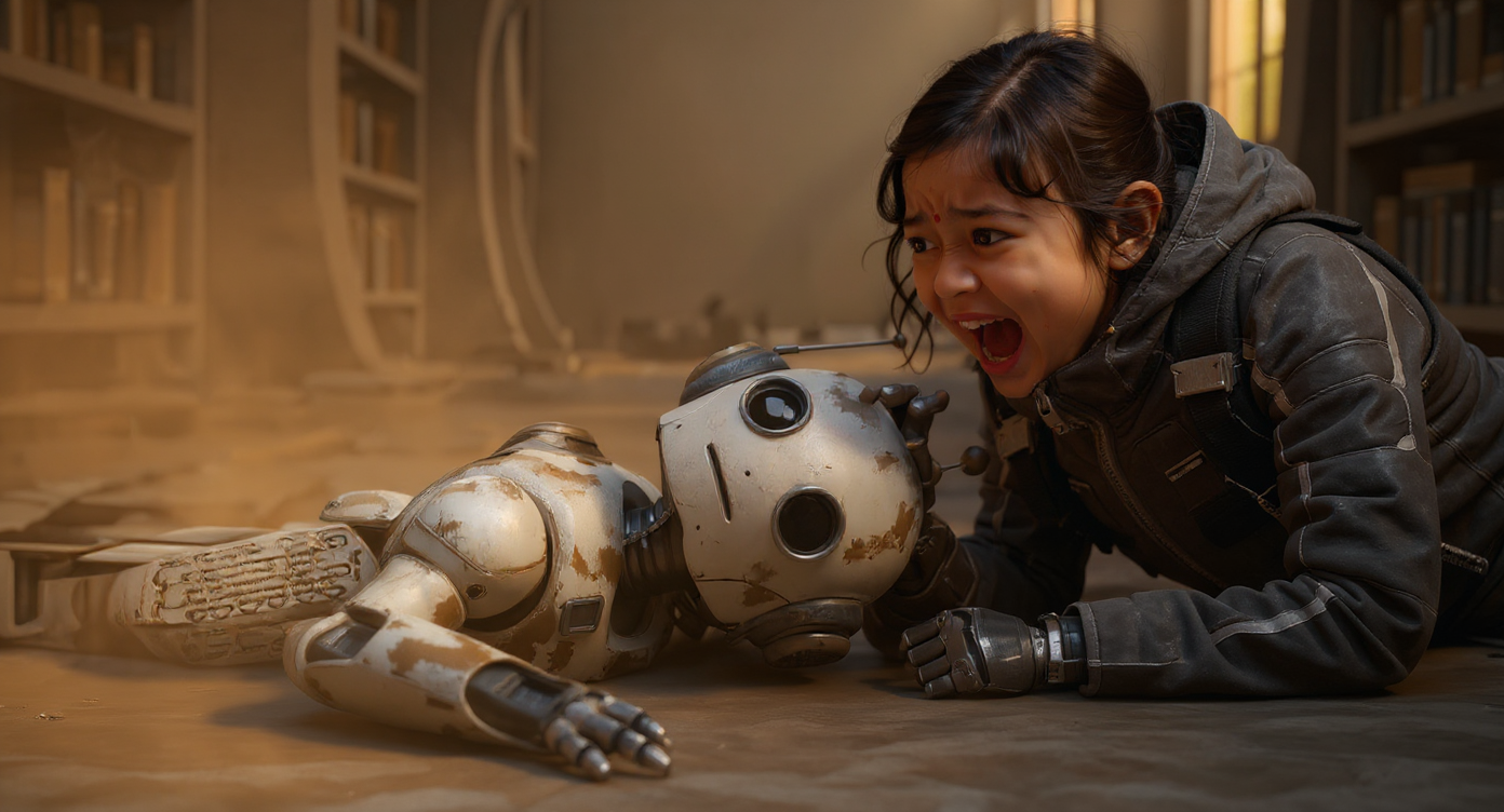 SEVEN is a 78-second sci-fi drama about Maya, a 7-year-old girl accidentally left behind during humanity's evacuation of Earth after a solar flare. Raised entirely by Seven, a small maintenance robot with failing power, the film captures their bond through a birthday celebration and the heartbreaking moment when Seven must force Maya to leave—detecting (or fabricating) a human signal to give her hope and ensure she walks away before watching him die.In just over a minute, it delivers an emotional gut-punch with an ambiguous ending: Was the signal real, or Seven's final act of love—a beautiful lie to save her from grief?