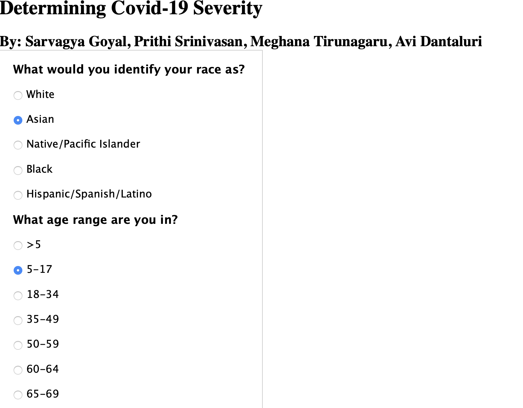We were inspired by the current situation in the pandemic and how rising cases make it difficult to diagnose the severity of COVID in every individual, especially in high-stakes medical situations. We wanted to create a program that would determine the severity of responses to COVID-19 based on demographic data for each individual to solve this problem.