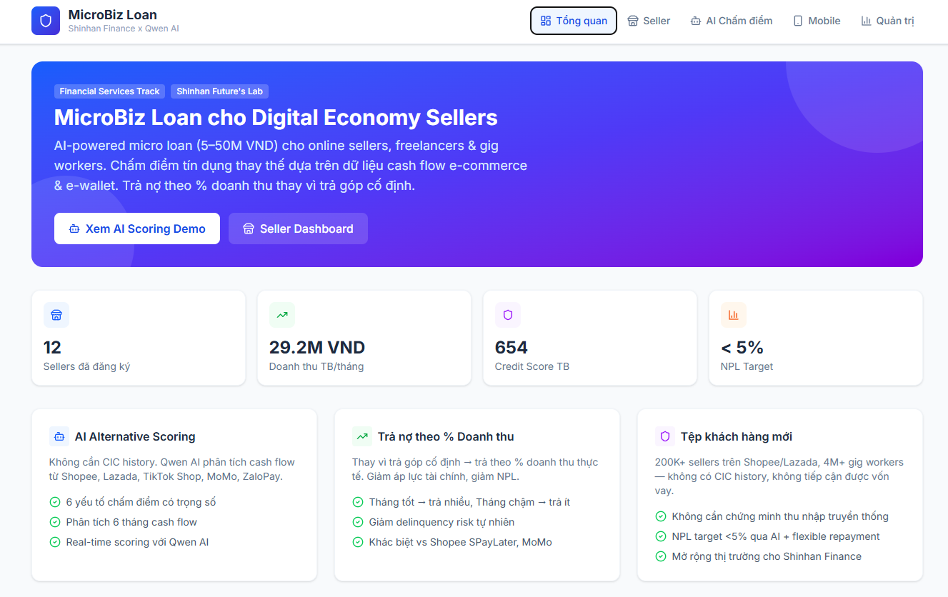 Shinhan Finance wants to reach this untapped market but lacks credit data. The sellers need capital but have no way to prove trustworthiness. We built SF12 to close this gap — using Qwen AI to transform e-commerce transaction data into actionable credit decisions, creating a win-win: sellers get working capital, banks get loyal customers with NPL <5%.