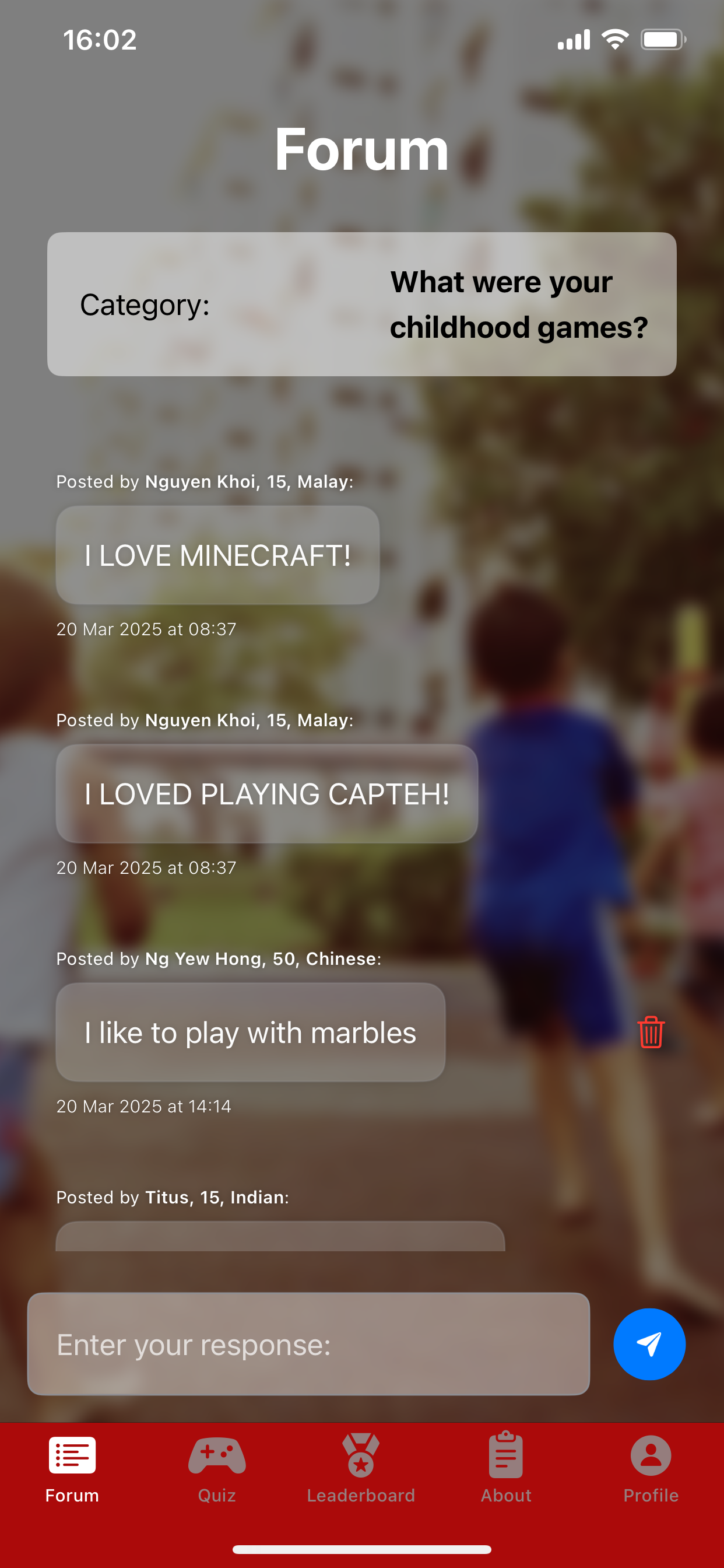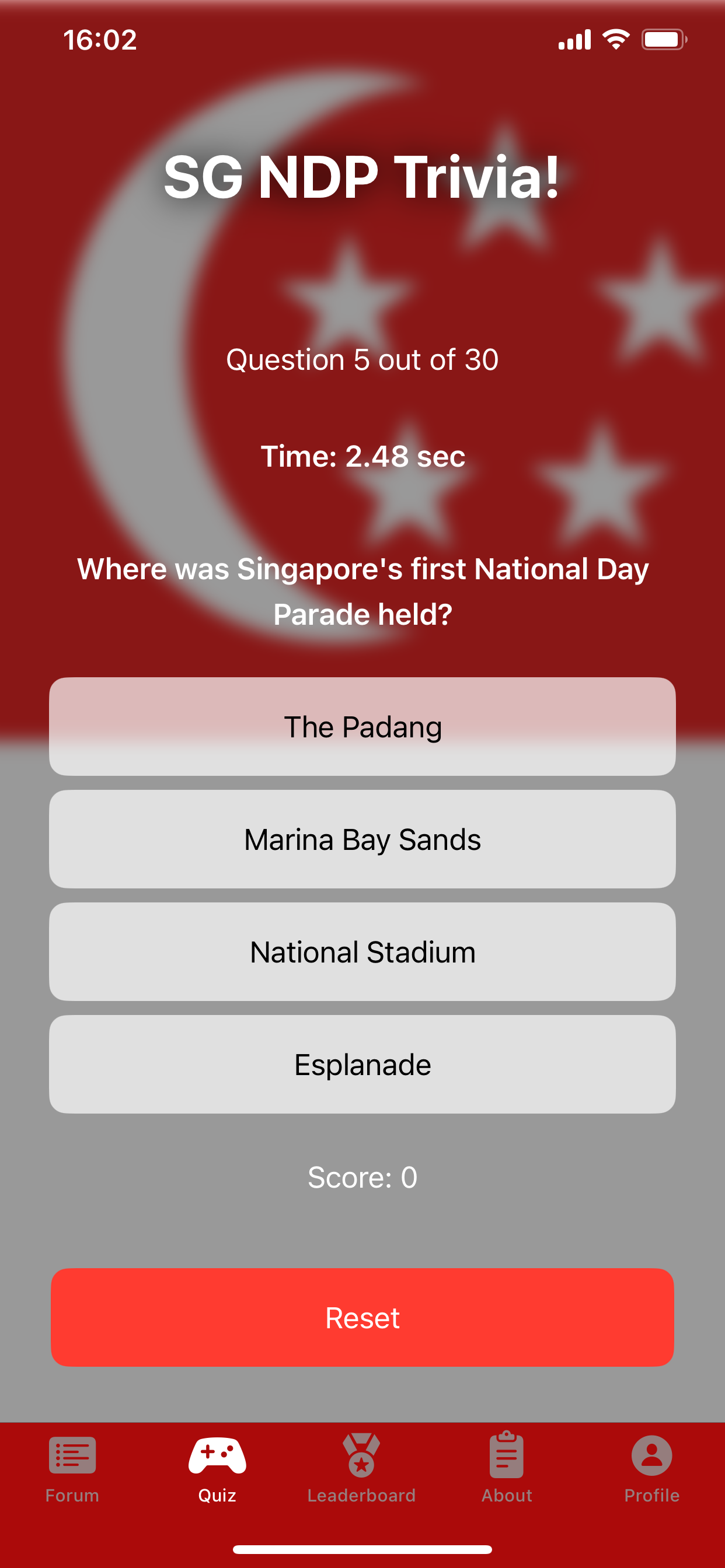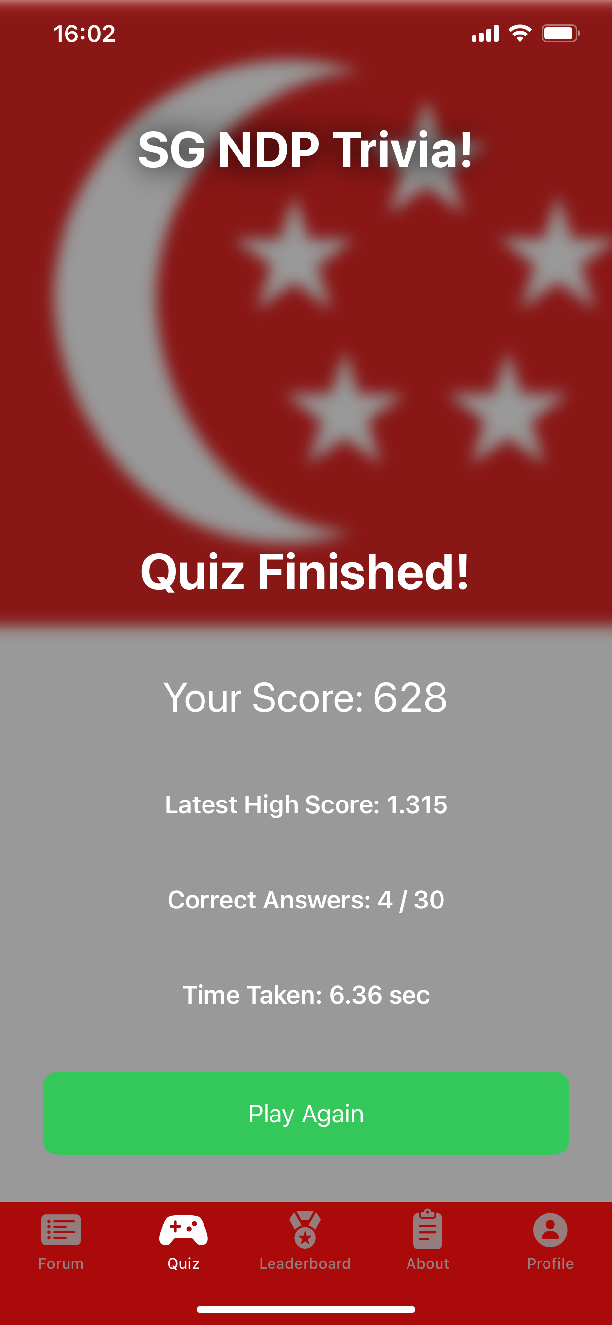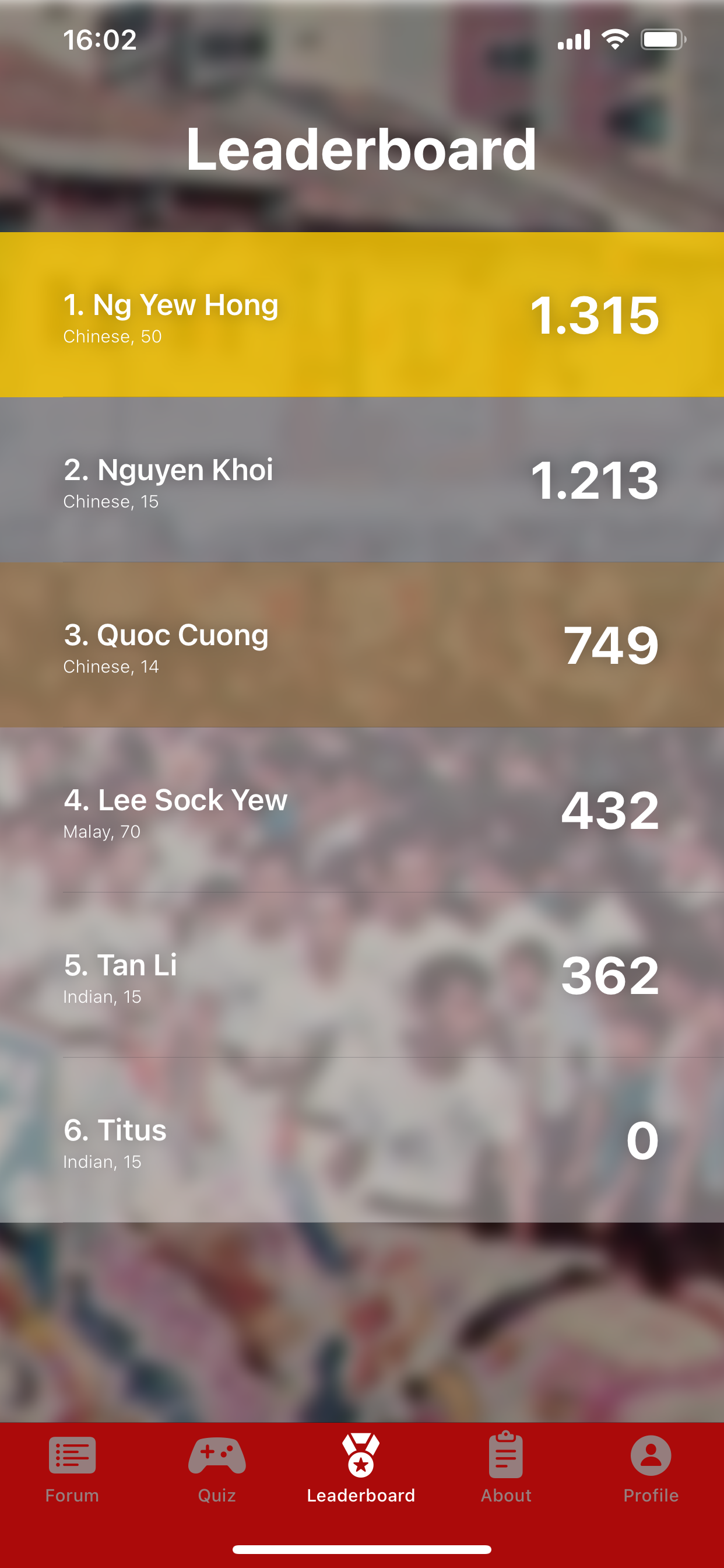 - There is also a trivia quiz about Singapore history where the score of each user is calculated by the percentage gotten correct and the time taken
