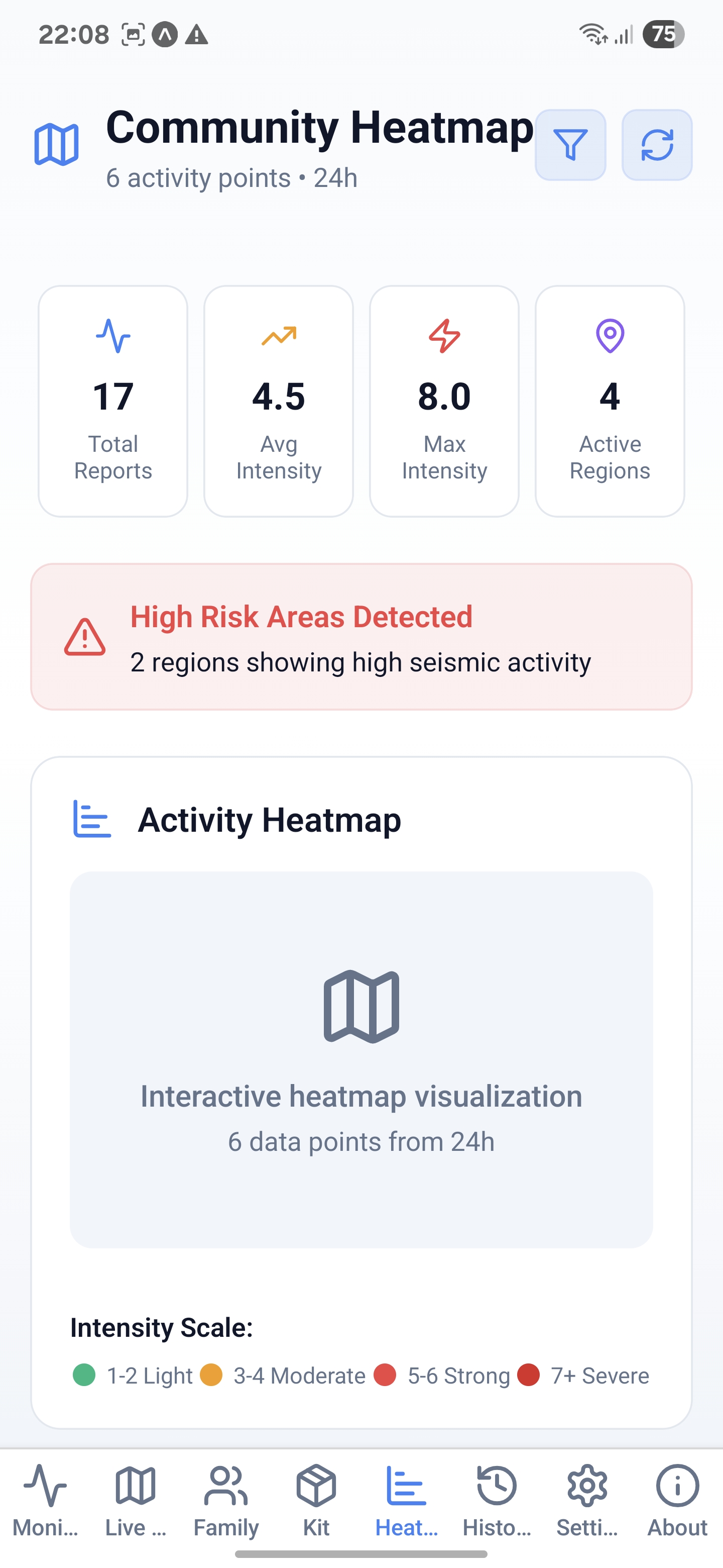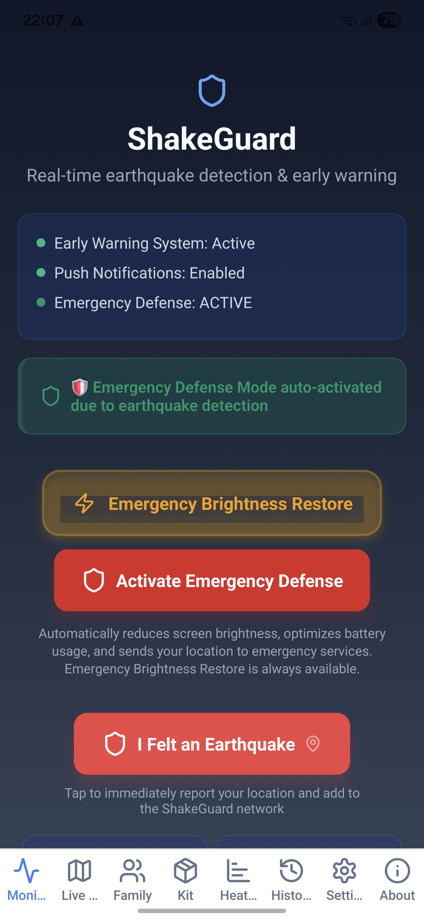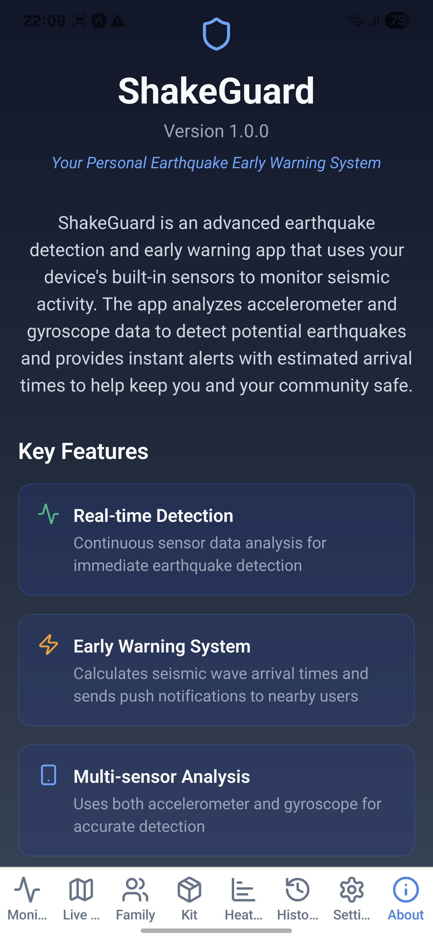 ShakeGuard is a comprehensive earthquake detection and emergency response app that transforms your smartphone into a personal seismic monitoring station.