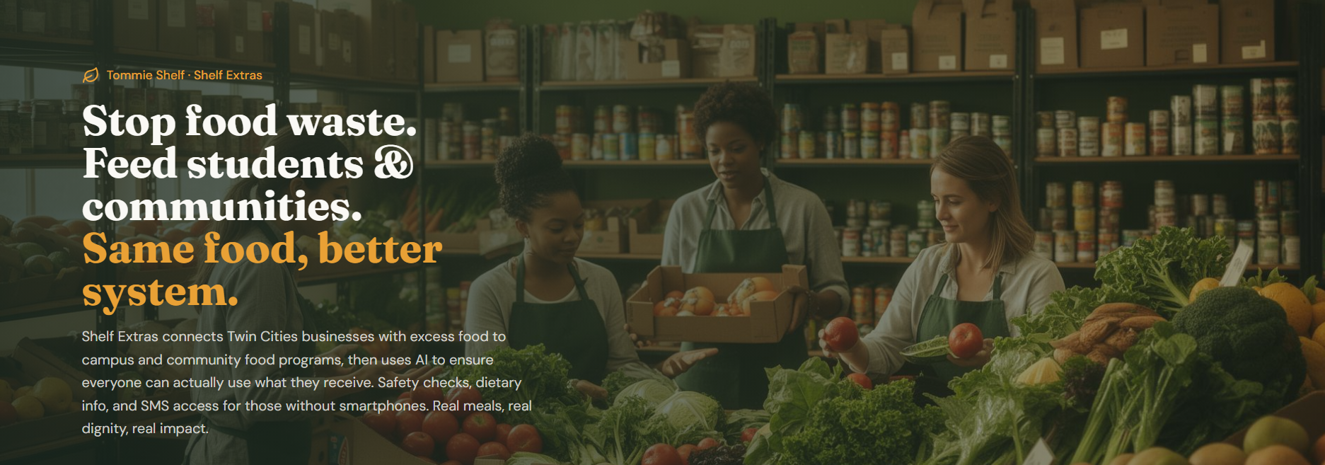 What it does: Shelf Extras AI scans food to translate labels, verify safety and dietary compatibility, generate recipes, and coordinate real-time inventory across 20+ Twin Cities locations with SMS access for those without smartphones. It eliminates language barriers, safety concerns, and operational gaps that prevent students from using donated food.