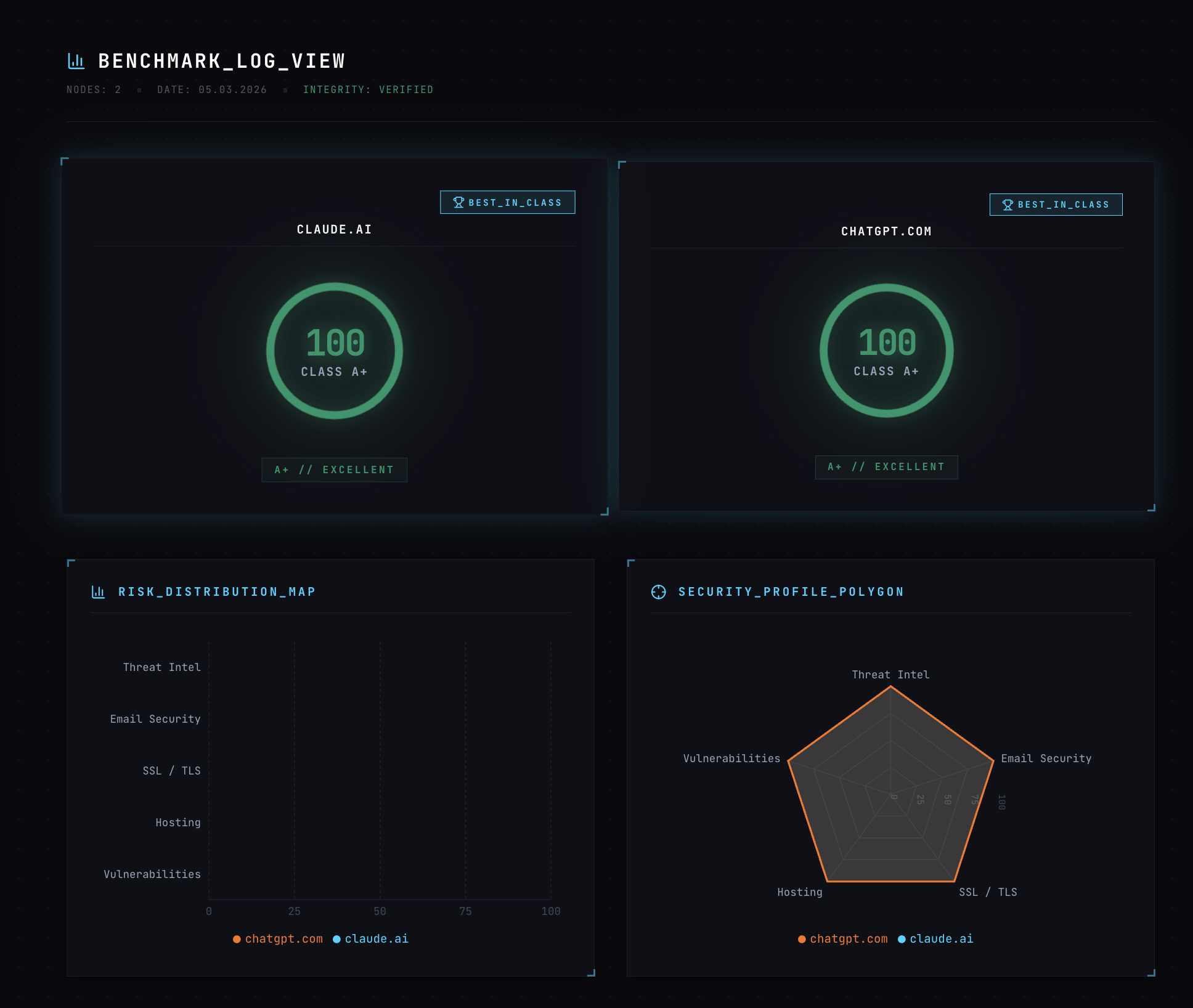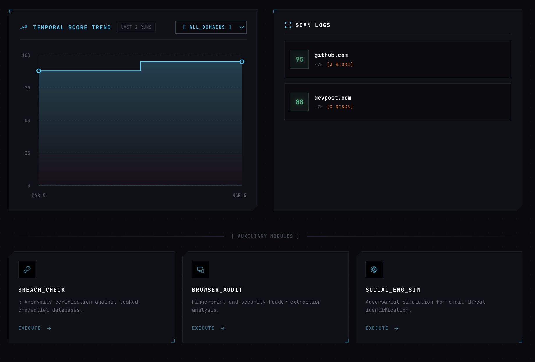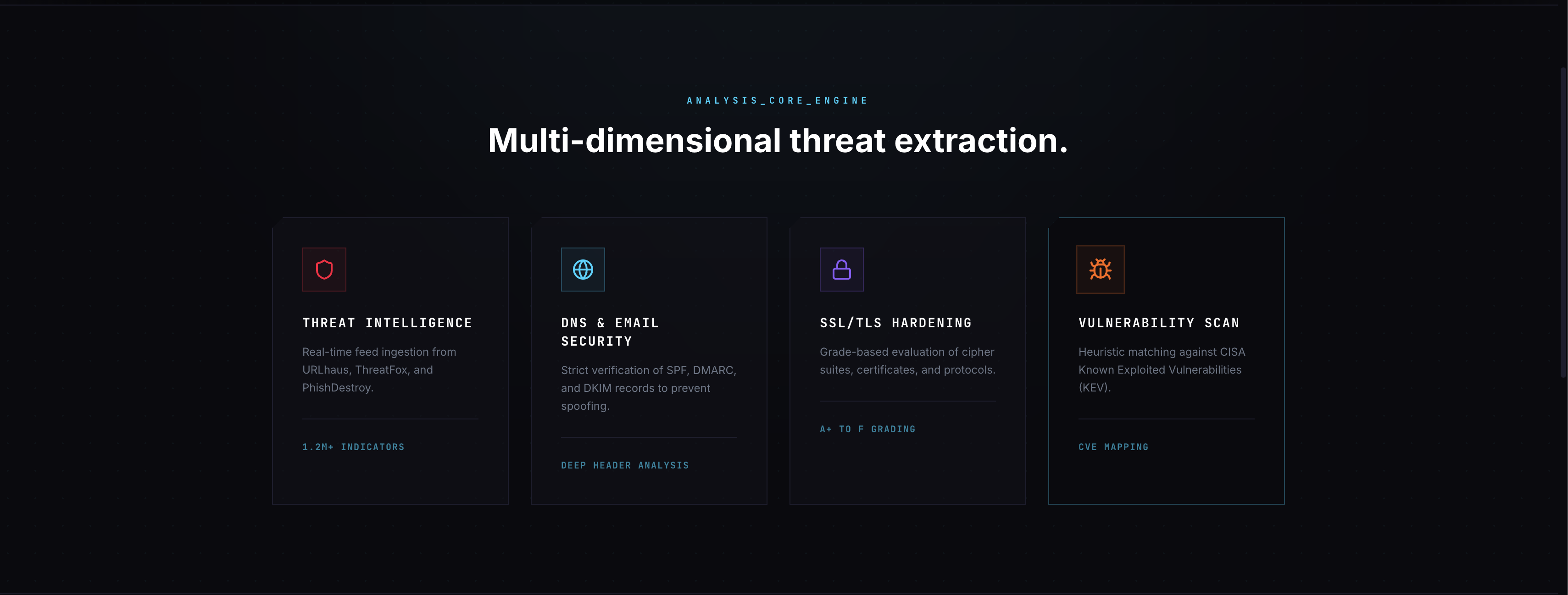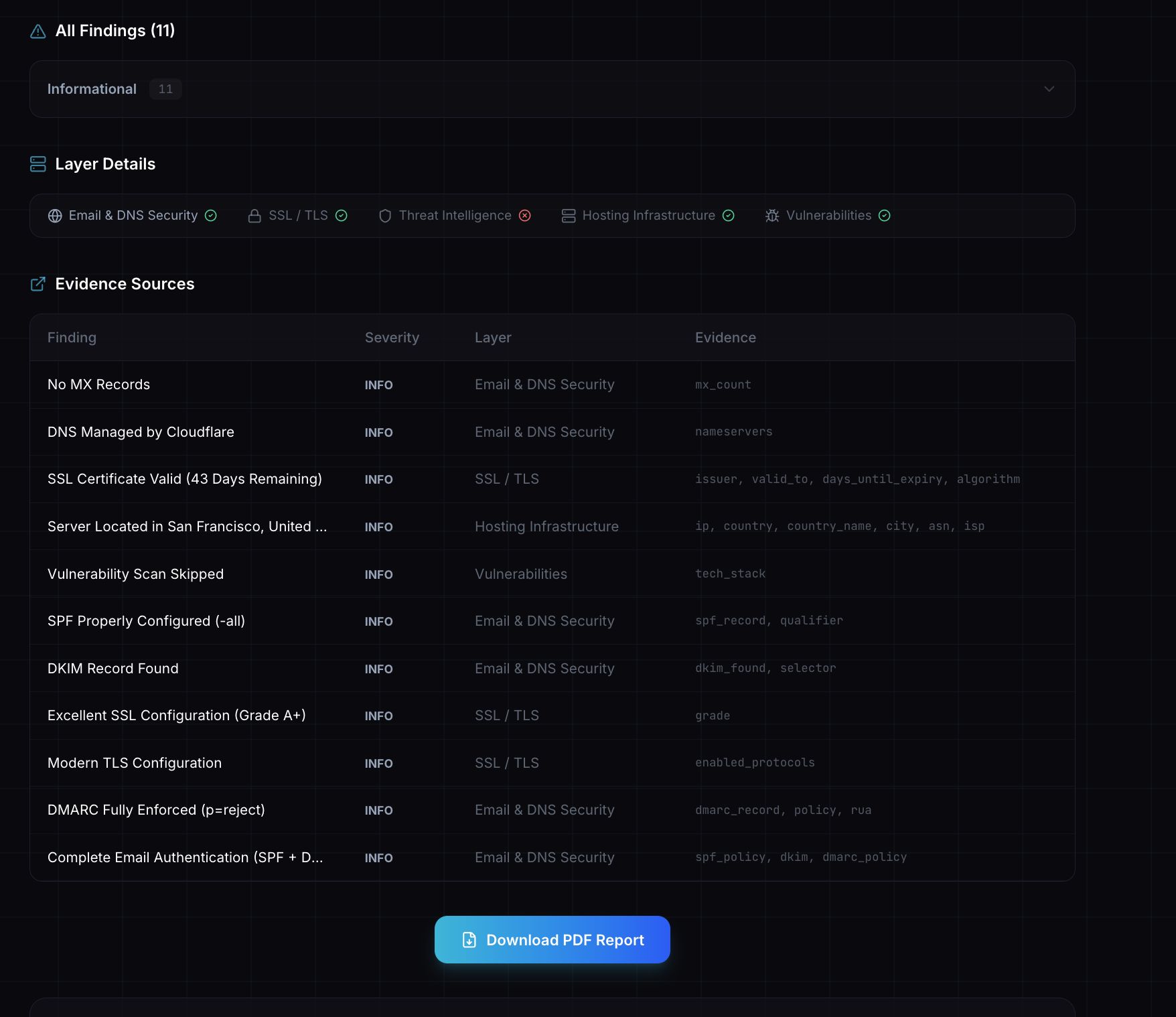 - Analyzes through 5 independent layers: DNS & Email Security, SSL/TLS Posture, Threat Intelligence, Hosting Trust, and Known Vulnerabilities — each with its own rule set (40+ rules total)