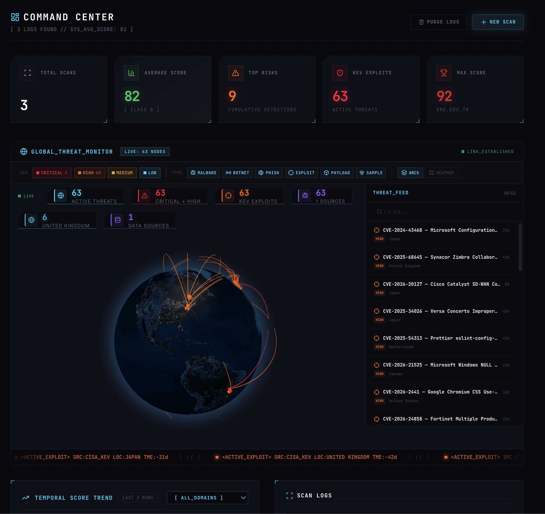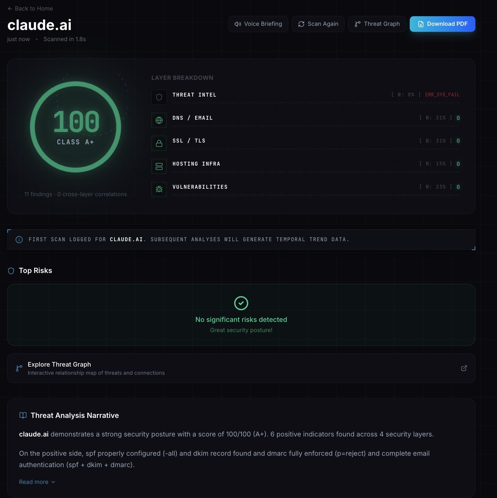 - Generates a one-click PDF report, an interactive threat graph, a live 3D threat radar, and a voice briefing
