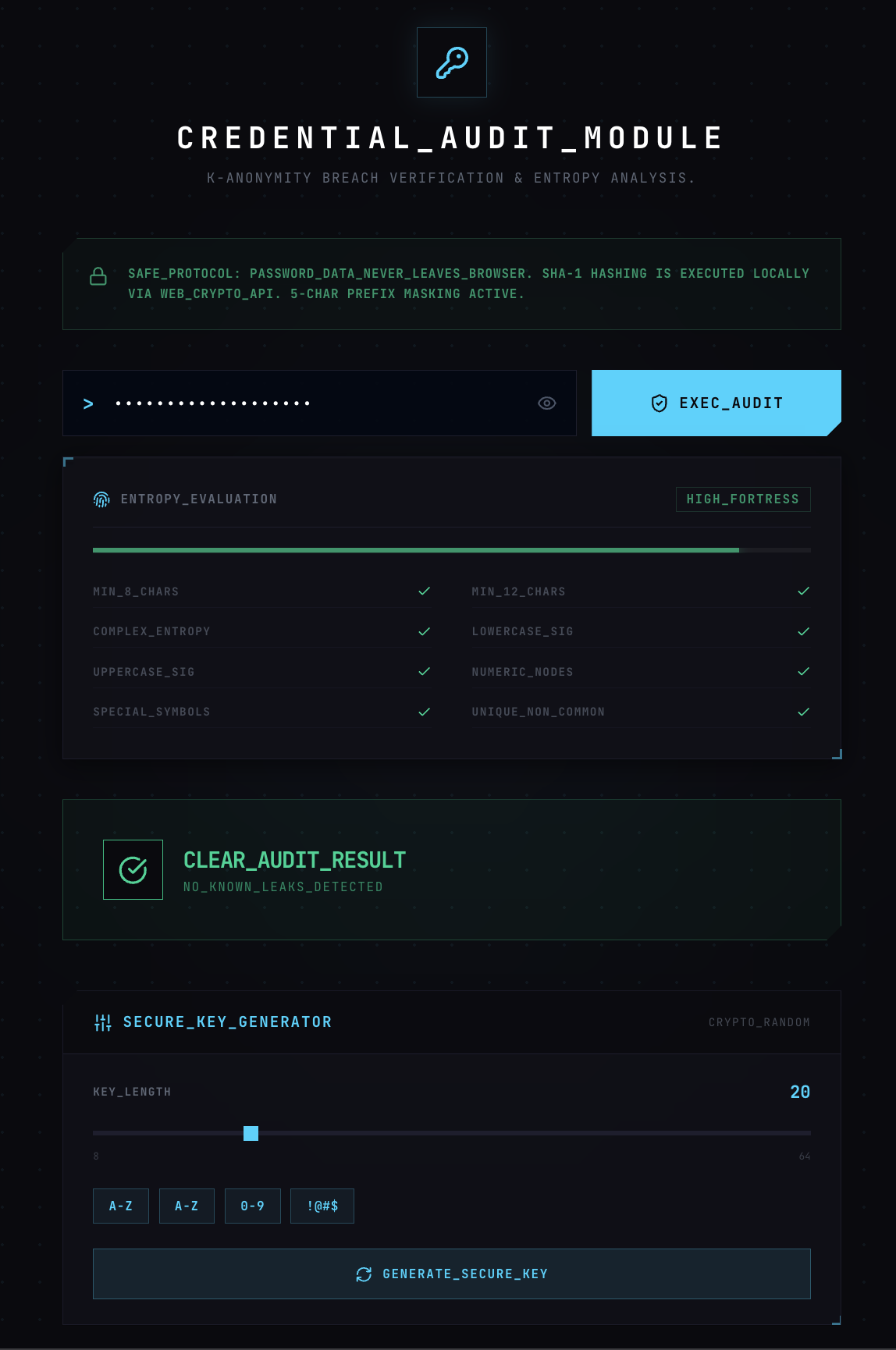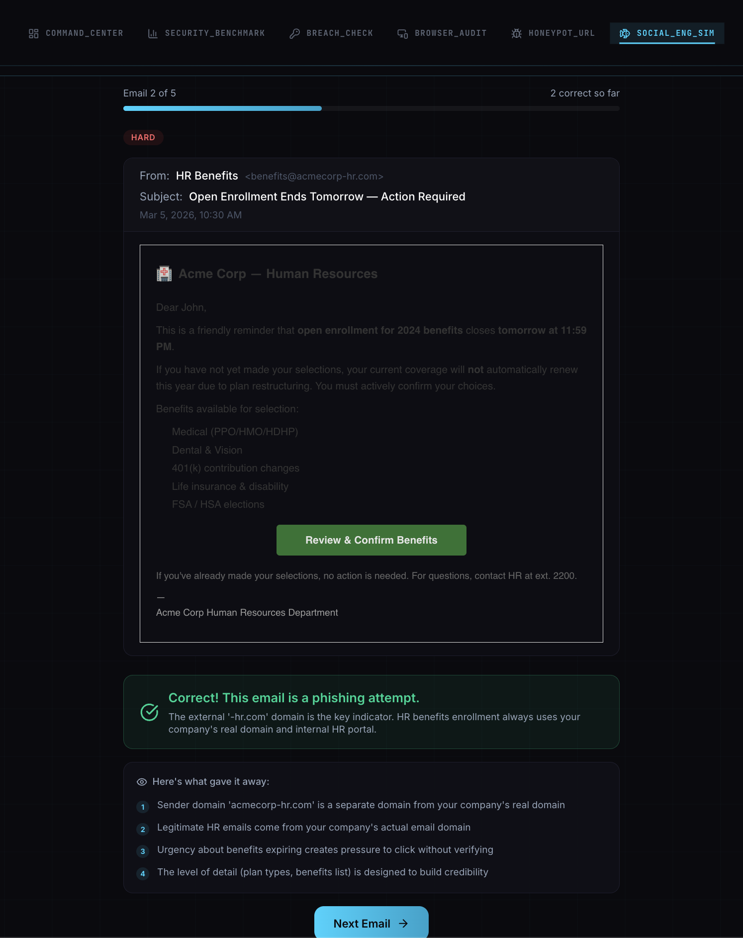 Additional tools: honeypot URL tracker, password breach checker, browser security audit, and phishing awareness quiz.