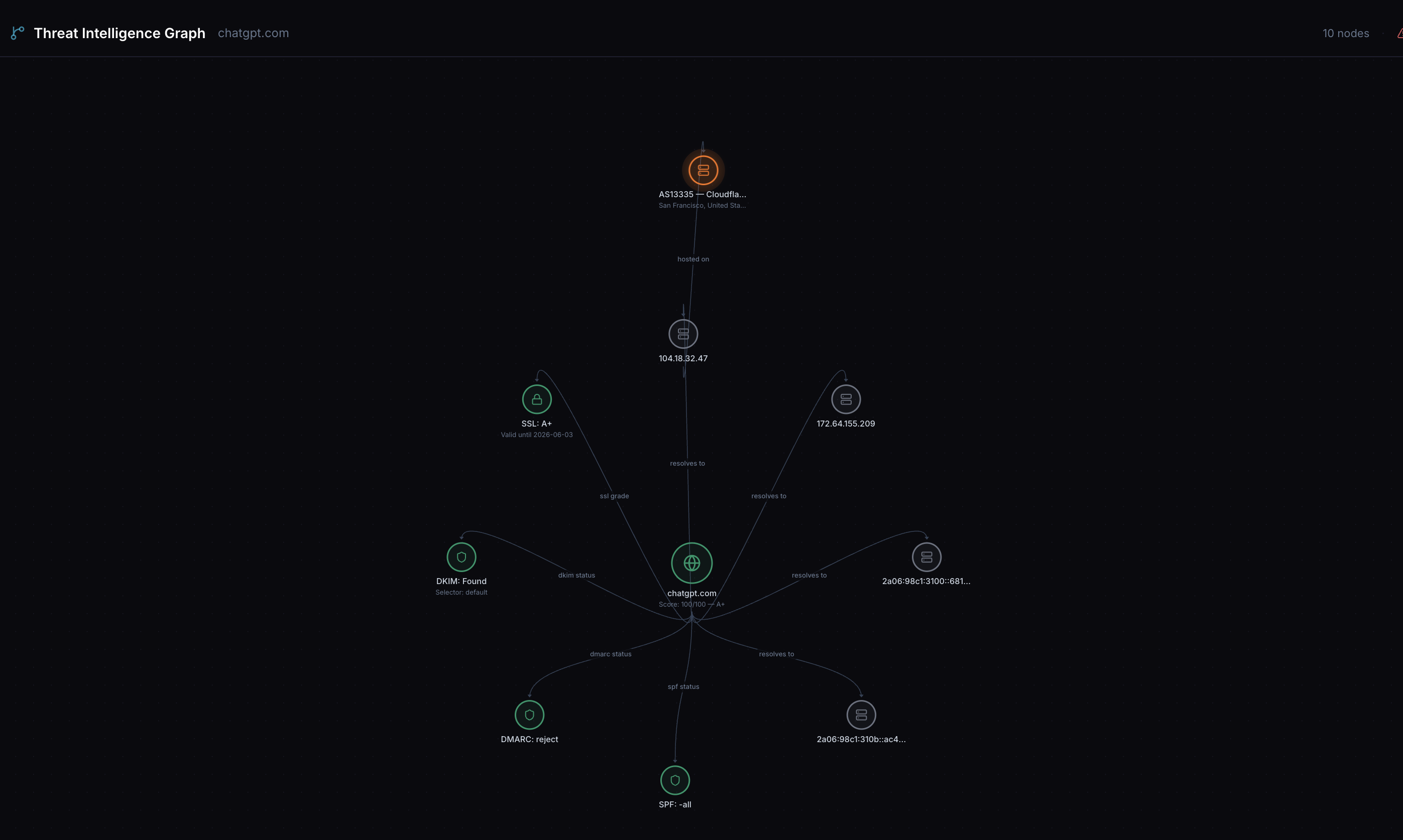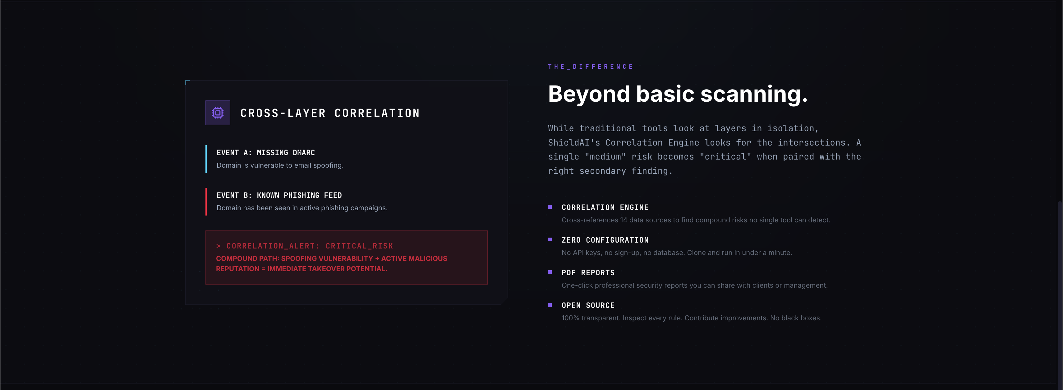 - Correlates across layers using 19 cross-layer rules that detect compound risks no single API can surface (e.g., "active threat IOC + expired SSL + no DMARC = compromised infrastructure being used for phishing")