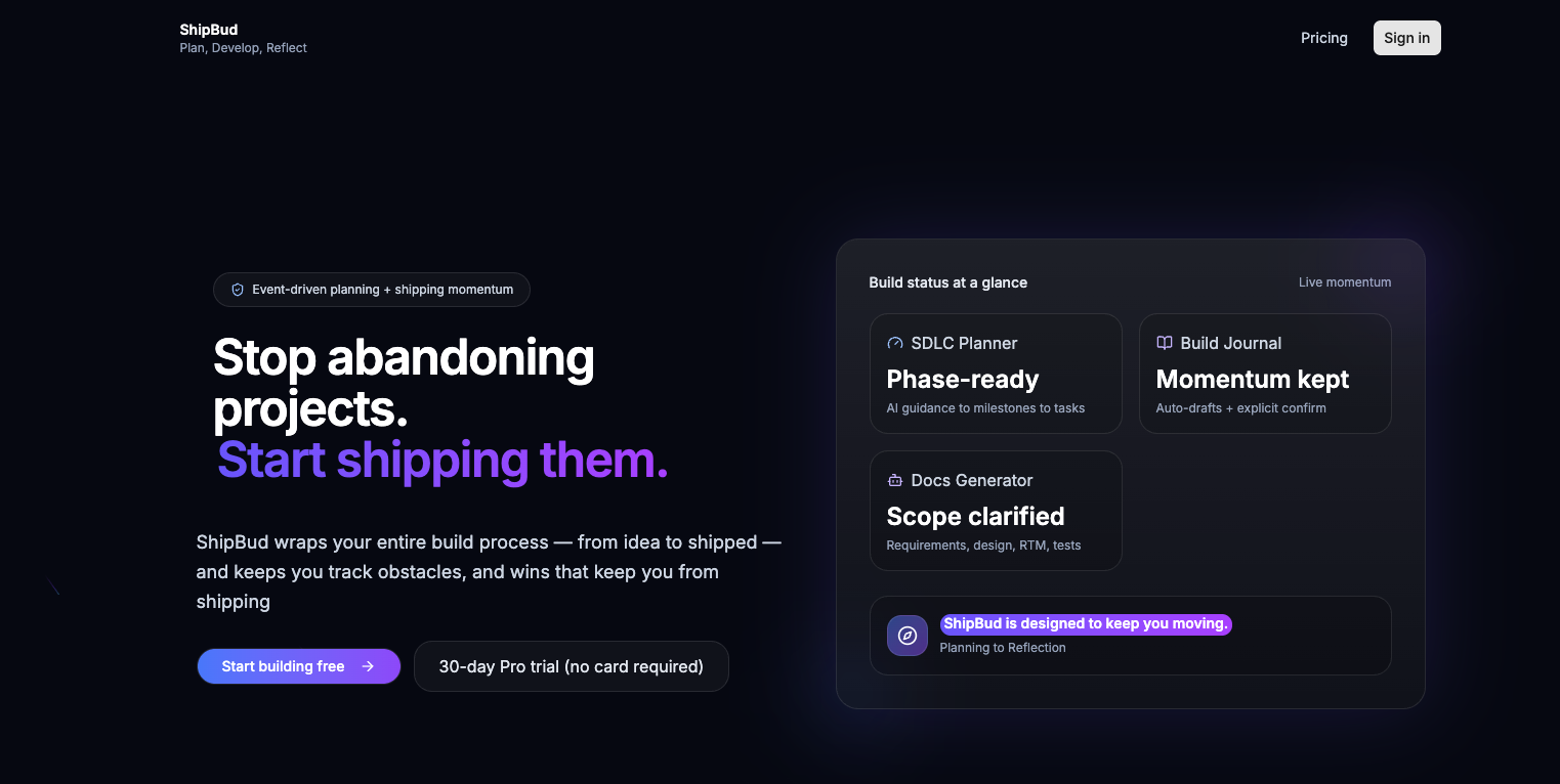 As a solo student developer, I kept starting projects the wrong way — jumping straight into code without proper planning, then struggling to explain what I built in interviews. I also had a ton of project activity happening that never turned into anything shareable. Sure, I could ask ChatGPT for help, but it's a blank slate — it doesn't know my project, my stack, or where I'm at in development. I wanted a tool that felt like a knowledgeable buddy sitting beside me with full context: one that helps me think through my software properly and helps me document the journey as I go. ShipBud is the tool I wished I had from day one.