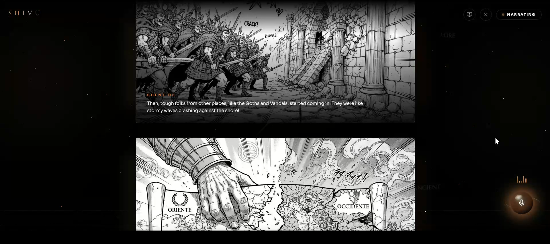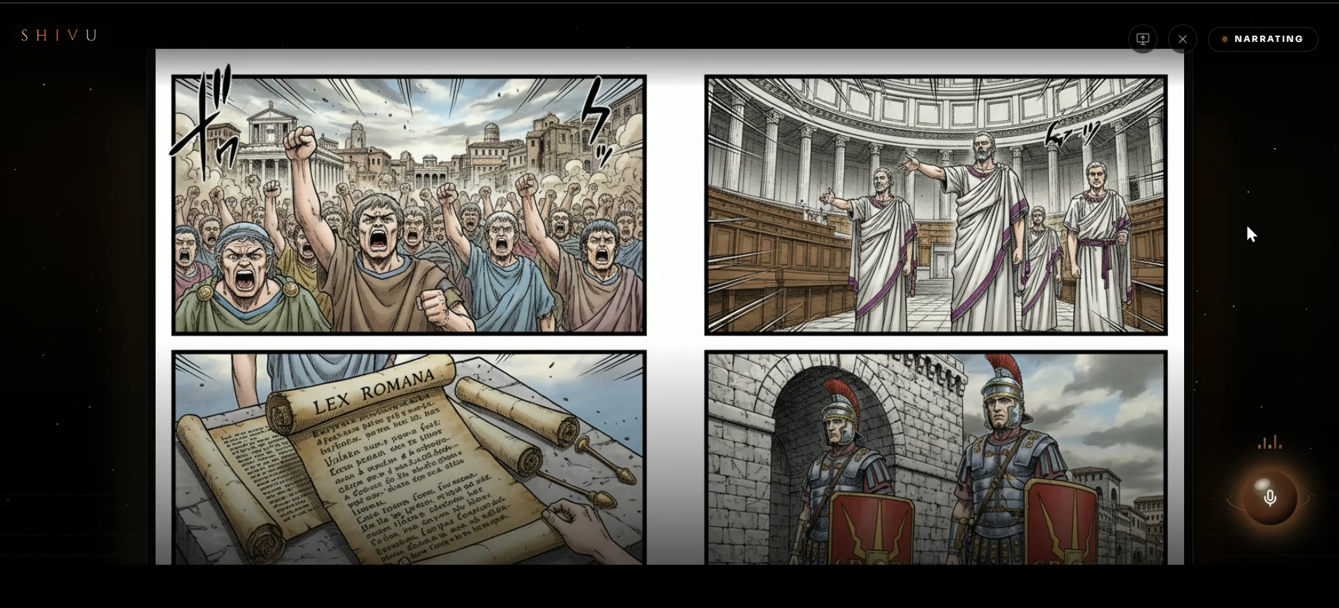 As Shivu speaks—using dramatic pauses, whispers for secrets, and high energy for battles—he proactively uses his "Vision" to generate full, multi-panel comic book pages that illustrate the exact scene he is describing. The visuals appear dynamically on your screen, creating a seamless audio-visual storytelling experience. Shivu never breaks character, ensuring you are completely immersed in the legend.